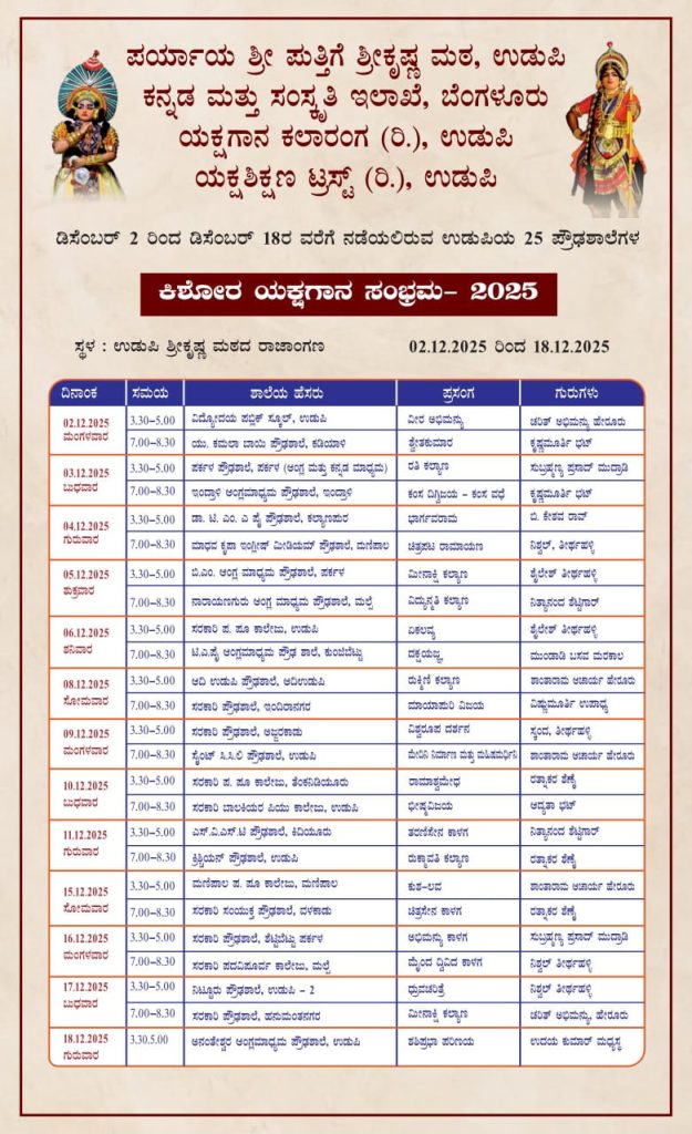 ಇವರ ನಿರ್ದೇಶನದಲ್ಲಿ ‘ವೀರ ಅಭಿಮನ್ಯು’ ಮತ್ತು ಕಡಿಯಾಳಿ ಯು. ಕಮಲಾ ಬಾಯಿ ಪ್ರೌಢಶಾಲೆಯ ಮಕ್ಕಳಿಂದ ಗುರು ಕೃಷ್ಣಮೂರ್ತಿ ಭಟ್ ಇವರ ನಿರ್ದೇಶನದಲ್ಲಿ ‘ಶ್ವೇತಕುಮಾರ’, ದಿನಾಂಕ 03 ಡಿಸೆಂಬರ್ 2025ರಂದು ಪರ್ಕಳ ಪ್ರೌಢಶಾಲೆ, ಪರ್ಕಳ (ಆಂಗ್ಲ ಮತ್ತು ಕನ್ನಡ ಮಾಧ್ಯಮ) ಮಕ್ಕಳಿಂದ ಗುರು ಸುಬ್ರಹ್ಮಣ್ಯ ಪ್ರಸಾದ್ ಮುದ್ರಾಡಿ ಇವರ ನಿರ್ದೇಶನದಲ್ಲಿ ‘ರತಿ ಕಲ್ಯಾಣ’ ಮತ್ತು ಇಂದ್ರಾಳಿ ಆಂಗ್ಲಮಾಧ್ಯಮ ಪ್ರೌಢಶಾಲೆಯ ಮಕ್ಕಳಿಂದ ಗುರು ಕೃಷ್ಣಮೂರ್ತಿ ಭಟ್ ಇವರ ನಿರ್ದೇಶನದಲ್ಲಿ ‘ಕಂಸ ದಿಗ್ವಿಜಯ – ಕಂಸ ವಧೆ’, ದಿನಾಂಕ 04 ಡಿಸೆಂಬರ್ 2025ರಂದು ಕಲ್ಯಾಣಪುರದ ಡಾ. ಟಿ.ಎಂ.ಎ. ಪೈ ಪ್ರೌಢಶಾಲೆಯ ಮಕ್ಕಳಿಂದ ಗುರು ಬಿ. ಕೇಶವ ರಾವ್ ಇವರ ನಿರ್ದೇಶನದಲ್ಲಿ ‘ಭಾರ್ಗವರಾಮ’ ಮತ್ತು ಮಣಿಪಾಲದ ಮಾಧವ ಕೃಪಾ ಇಂಗ್ಲೀಷ್ ಮೀಡಿಯಮ್ ಪ್ರೌಢಶಾಲೆಯ ಮಕ್ಕಳಿಂದ ಗುರು ನಿಶ್ಚಲ್, ತೀರ್ಥಹಳ್ಳಿ ಇವರ ನಿರ್ದೇಶನದಲ್ಲಿ ‘ಚಿತ್ರಪಟ ರಾಮಾಯಣ’, ದಿನಾಂಕ 05 ಡಿಸೆಂಬರ್ 2025ರಂದು ಪರ್ಕಳ ಬಿ.ಎಂ. ಆಂಗ್ಲ ಮಾಧ್ಯಮ ಪ್ರೌಢಶಾಲೆಯ ಮಕ್ಕಳಿಂದ ಗುರು ಶೈಲೇಶ್ ತೀರ್ಥಹಳ್ಳಿ ಇವರ ನಿರ್ದೇಶನದಲ್ಲಿ ‘ಮೀನಾಕ್ಷಿ ಕಲ್ಯಾಣ’ ಮತ್ತು ಮಲ್ಪೆ ನಾರಾಯಣಗುರು ಆಂಗ್ಲ ಮಾಧ್ಯಮ ಪ್ರೌಢಶಾಲೆಯ ಮಕ್ಕಳಿಂದ ಗುರು ನಿತ್ಯಾನಂದ ಶೆಟ್ಟಿಗಾರ್ ಇವರ ನಿರ್ದೇಶನದಲ್ಲಿ ‘ವಿದ್ಯುನ್ಮತಿ ಕಲ್ಯಾಣ’, ದಿನಾಂಕ 06 ಡಿಸೆಂಬರ್ 2025ರಂದು ಉಡುಪಿ ಸರಕಾರಿ ಪ. ಪೂ ಕಾಲೇಜು ಮಕ್ಕಳಿಂದ ಗುರು ಶೈಲೇಶ್ ತೀರ್ಥಹಳ್ಳಿ ಇವರ ನಿರ್ದೇಶನದಲ್ಲಿ ‘ಏಕಲವ್ಯ’ ಮತ್ತು ಕುಂಜಿಬೆಟ್ಟು ಟಿ.ಎ.ಪೈ ಆಂಗ್ಲಮಾಧ್ಯಮ ಪ್ರೌಢ ಶಾಲೆಯ ಮಕ್ಕಳಿಂದ ಗುರು ಮುಂಡಾಡಿ ಬಸವ ಮರಕಾಲ ಇವರ ನಿರ್ದೇಶನದಲ್ಲಿ ‘ದಕ್ಷಯಜ್ಞ’, ದಿನಾಂಕ 08 ಡಿಸೆಂಬರ್ 2025ರಂದು ಆದಿ ಉಡುಪಿ ಪ್ರೌಢ ಶಾಲೆಯ ಮಕ್ಕಳಿಂದ ಗುರು ಶಾಂತಾರಾಮ ಆಚಾರ್ಯ ಹೇರೂರು ಇವರ ನಿರ್ದೇಶನದಲ್ಲಿ ‘ರುಕ್ಮಿಣಿ ಕಲ್ಯಾಣ’ ಮತ್ತು ಇಂದಿರಾನಗರ ಸರಕಾರಿ ಪ್ರೌಢಶಾಲೆಯ ಮಕ್ಕಳಿಂದ ಗುರು ವಿಷ್ಣುಮೂರ್ತಿ ಉಪಾಧ್ಯ ಇವರ ನಿರ್ದೇಶನದಲ್ಲಿ ‘ಮಾಯಾಪುರಿ ವಿಜಯ’, ದಿನಾಂಕ 09 ಡಿಸೆಂಬರ್ 2025ರಂದು ಅಜ್ಜರಕಾಡು ಸರಕಾರಿ ಪ್ರೌಢಶಾಲೆಯ ಮಕ್ಕಳಿಂದ ಗುರು ಸ್ಕಂದ ತೀರ್ಥಹಳ್ಳಿ ಇವರ ನಿರ್ದೇಶನದಲ್ಲಿ ‘ವಿಶ್ವರೂಪ ದರ್ಶನ’ ಮತ್ತು ಉಡುಪಿ ಸೈಂಟ್ ಸಿಸಿಲಿ ಪ್ರೌಢ ಶಾಲೆಯ ಮಕ್ಕಳಿಂದ ಗುರು ಶಾಂತಾರಾಮ ಆಚಾರ್ಯ ಹೇರೂರು ಇವರ ನಿರ್ದೇಶನದಲ್ಲಿ ‘ಮೇದಿನಿ ನಿರ್ಮಾಣ ಮತ್ತು ಮಹಿಷ ಮರ್ಧಿನಿ’, ದಿನಾಂಕ 10 ಡಿಸೆಂಬರ್ 2025ರಂದು ತೆಂಕನಿಡಿಯೂರು ಸರಕಾರಿ ಪ. ಪೂ. ಕಾಲೇಜು ಮಕ್ಕಳಿಂದ ಗುರು ರತ್ನಾಕರ ಶೆಣೈ ಇವರ ನಿರ್ದೇಶನದಲ್ಲಿ ‘ರಾಮಾಶ್ವಮೇಧ’ ಮತ್ತು ಉಡುಪಿ ಸರಕಾರಿ ಬಾಲಕಿಯರ ಪಿ.ಯು. ಕಾಲೇಜು ಮಕ್ಕಳಿಂದ ಗುರು ಆದ್ಯತಾ ಭಟ್ ಇವರ ನಿರ್ದೇಶನದಲ್ಲಿ ‘ಭೀಷ್ಮವಿಜಯ’, ದಿನಾಂಕ 11 ಡಿಸೆಂಬರ್ 2025ರಂದು ಕಿದಿಯೂರು ಎಸ್.ವಿ.ಎಸ್.ಟಿ ಪ್ರೌಢಶಾಲೆಯ ಮಕ್ಕಳಿಂದ ಗುರು ನಿತ್ಯಾನಂದ ಶೆಟ್ಟಿಗಾರ್ ಇವರ ನಿರ್ದೇಶನದಲ್ಲಿ ‘ತರಣಿಸೇನ ಕಾಳಗ’ ಮತ್ತು ಉಡುಪಿಯ ಕ್ರಿಶ್ಚಿಯನ್ ಪ್ರೌಢಶಾಲೆಯ ಮಕ್ಕಳಿಂದ ಗುರು ರತ್ನಾಕರ ಶೆಣೈ ಇವರ ನಿರ್ದೇಶನದಲ್ಲಿ ‘ರುಕ್ಮಾವತಿ ಕಲ್ಯಾಣ’, ದಿನಾಂಕ 15 ಡಿಸೆಂಬರ್ 2025ರಂದು ಮಣಿಪಾಲ ಪ. ಪೂ. ಕಾಲೇಜು ಮಕ್ಕಳಿಂದ ಗುರು ಶಾಂತಾರಾಮ ಆಚಾರ್ಯ ಹೇರೂರು ಇವರ ನಿರ್ದೇಶನದಲ್ಲಿ ‘ಕುಶ-ಲವ’ ಮತ್ತು ವಳಕಾಡು ಸರಕಾರಿ ಸಂಯುಕ್ತ ಪ್ರೌಢಶಾಲೆಯ ಮಕ್ಕಳಿಂದ ಗುರು ರತ್ನಾಕರ ಶೆಣೈ ಇವರ ನಿರ್ದೇಶನದಲ್ಲಿ ‘ಚಿತ್ರ