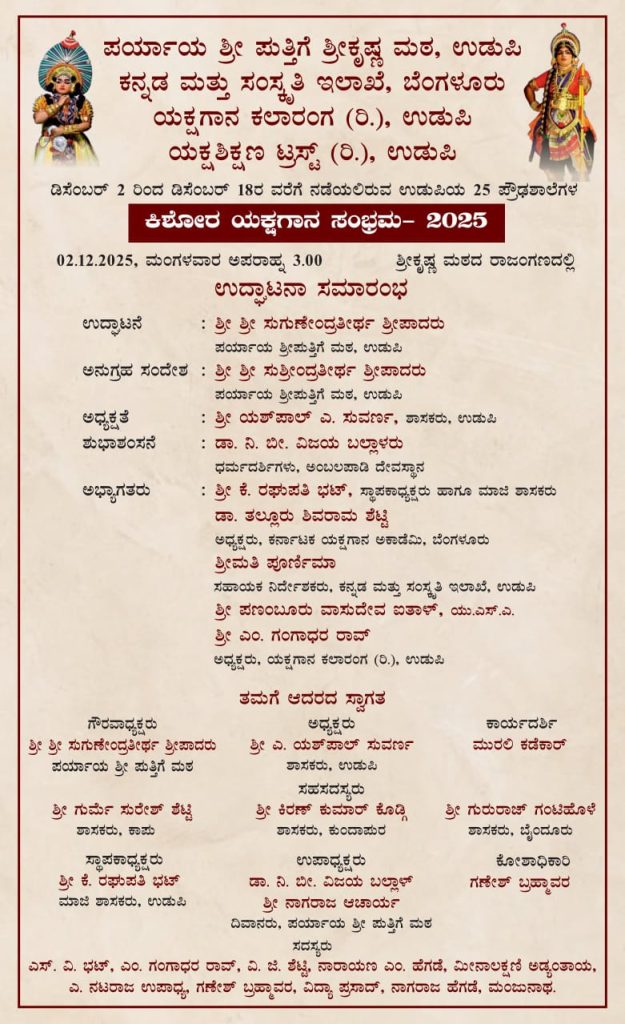 ಉಡುಪಿ : ಪರ್ಯಾಯ ಶ್ರೀ ಪುತ್ತಿಗೆ ಶ್ರೀಕೃಷ್ಣ ಮಠ ಉಡುಪಿ, ಕನ್ನಡ ಮತ್ತು ಸಂಸ್ಕೃತಿ ಇಲಾಖೆ ಬೆಂಗಳೂರು, ಯಕ್ಷಗಾನ ಕಲಾರಂಗ (ರಿ.) ಉಡುಪಿ ಮತ್ತು ಯಕ್ಷಶಿಕ್ಷಣ ಟ್ರಸ್ಟ್ (ರಿ.) ಉಡುಪಿ ಇವರ ವತಿಯಿಂದ ದಿನಾಂಕ 02ರಿಂದ 18 ಡಿಸೆಂಬರ್ 2025ರವರೆಗೆ ಉಡುಪಿಯ 25 ಪ್ರೌಢಶಾಲೆಗಳ ವಿದ್ಯಾರ್ಥಿಗಳಿಂದ ಪ್ರದರ್ಶನಗೊಳ್ಳಲಿರುವ ‘ಕಿಶೋರ ಯಕ್ಷಗಾನ ಸಂಭ್ರಮ – 2025’ವನ್ನು ದಿನಾಂಕ 02 ಡಿಸೆಂಬರ್ 2025ರಂದು ಅಪರಾಹ್ನ 3-00 ಗಂಟೆಗೆ ಉಡುಪಿ ಶ್ರೀ ಕೃಷ್ಣ ಮಠದಲ್ಲಿ ಉದ್ಘಾಟನೆಗೊಳ್ಳಲಿದೆ.