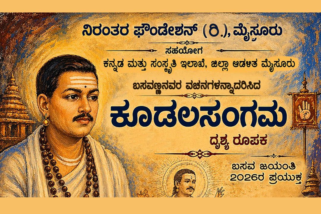 ಮೈಸೂರು : ನಿರಂತರ ಫೌಂಡೇಶನ್ (ರಿ) ಮೈಸೂರು ಇದರ ವತಿಯಿಂದ ಕನ್ನಡ ಮತ್ತು ಸಂಸ್ಕೃತಿ ಇಲಾಖೆ ಜಿಲ್ಲಾ ಆಡಳಿತ ಮೈಸೂರು ಇವರ ಸಹಯೋಗದೊಂದಿಗೆ ಬಸವ ಜಯಂತಿ ಪ್ರಯುಕ್ತ ಬಸವಣ್ಣನವರ ವಚನಗಳನ್ನಾದರಿಸಿದ ‘ಕೂಡಲಸಂಗಮ’ ದೃಶ್ಯ ರೂಪಕವನ್ನು ದಿನಾಂಕ 19 ಏಪ್ರಿಲ್ 2026ರಂದು ಸಂಜೆ 6-00 ಗಂಟೆಗೆ ಮೈಸೂರಿನ ಕಲಾಮಂದಿರದಲ್ಲಿ ಹಮ್ಮಿಕೊಳ್ಳಲಾಗಿದೆ. ಪ್ರಸಾದ್ ಕುಂದೂರು ಸಾಹಿತ್ಯ ಮತ್ತು ವಿನ್ಯಾಸ, ಡಾ. ಸಿ. ಅಶ್ವತ್ ಸಂಗೀತ ಹಾಗೂ ಸುಗುಣ ಎಂ.ಎಂ. ನಿರ್ದೇಶನ ಮಾಡಿರುತ್ತಾರೆ.