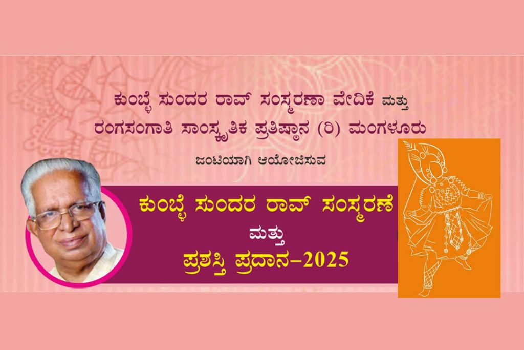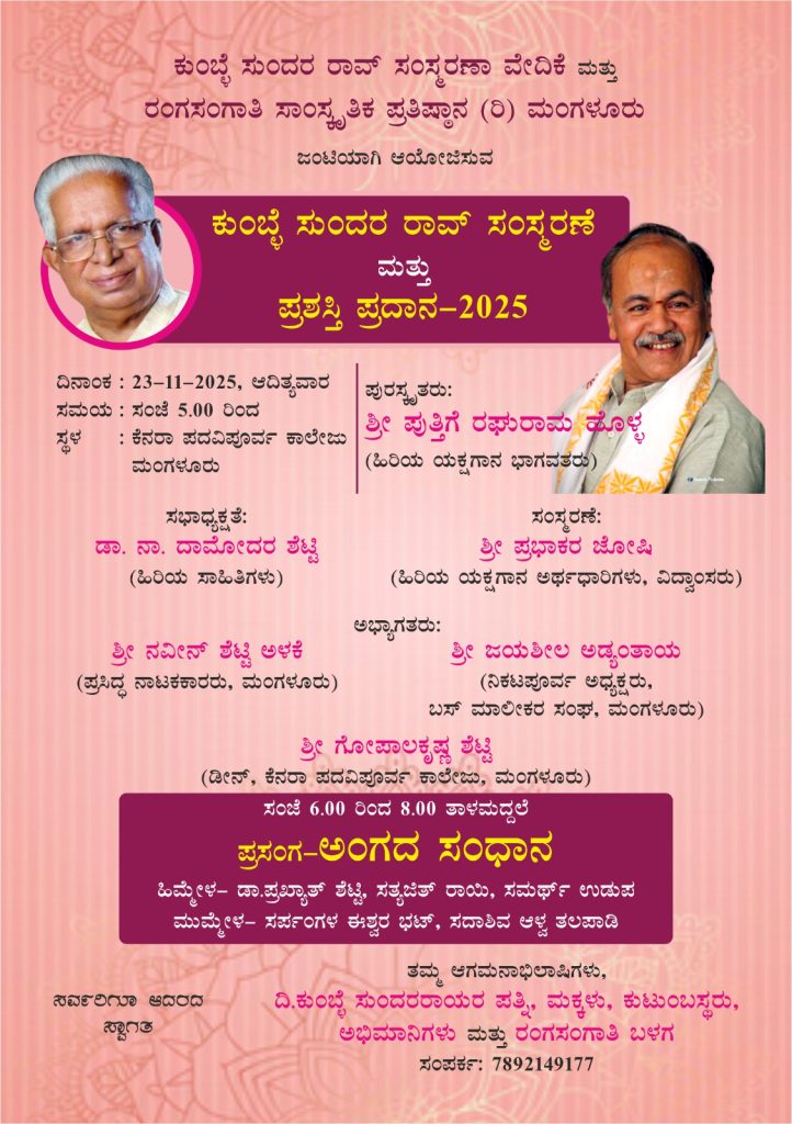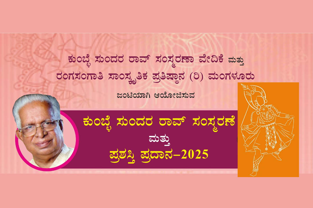ಮಂಗಳೂರು : ಕುಂಬ್ಳೆ ಸುಂದರ ರಾವ್ ಸಂಸ್ಮರಣಾ ವೇದಿಕೆ ಮತ್ತು ರಂಗಸಂಗಾತಿ ಸಾಂಸ್ಕೃತಿಕ ಪ್ರತಿಷ್ಠಾನ (ರಿ.) ಮಂಗಳೂರು ಜಂಟಿಯಾಗಿ ಆಯೋಜಿಸುವ ಕುಂಬ್ಳೆ ಸುಂದರ ರಾವ್ ಸಂಸ್ಮರಣೆ ಮತ್ತು ಪ್ರಶಸ್ತಿ ಪ್ರದಾನ ಕಾರ್ಯಕ್ರಮವನ್ನು ದಿನಾಂಕ 23 ನವೆಂಬರ್ 2025ರಂದು ಸಂಜೆ 5-00 ಗಂಟೆಗೆ ಮಂಗಳೂರಿನ ಕೆನರಾ ಪದವಿಪೂರ್ವ ಕಾಲೇಜಿನ ಸಭಾಂಗಣದಲ್ಲಿ ಹಮ್ಮಿಕೊಳ್ಳಲಾಗಿದೆ.