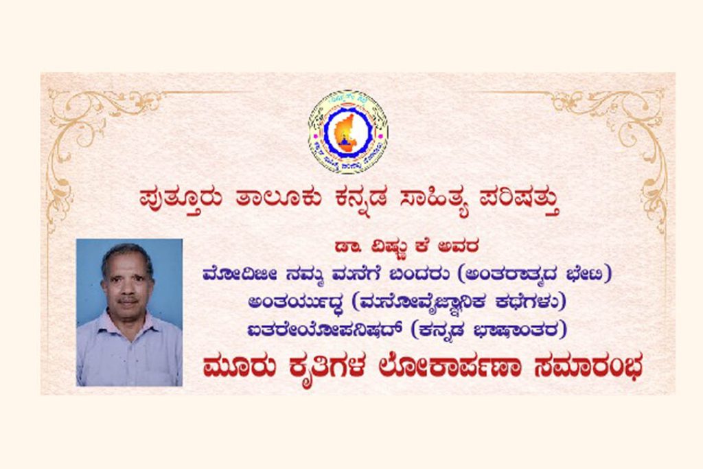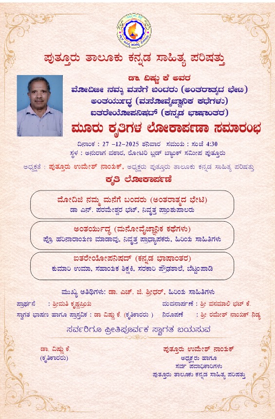 ಪುತ್ತೂರು : ಪುತ್ತೂರು ತಾಲೂಕು ಕನ್ನಡ ಸಾಹಿತ್ಯ ಪರಿಷತ್ತು ಇದರ ವತಿಯಿಂದ ಕೆ. ವಿಷ್ಣು ಕೆ. ಇವರ ಮೂರು ಕೃತಿಗಳ ಲೋಕಾರ್ಪಣಾ ಸಮಾರಂಭವನ್ನು ದಿನಾಂಕ 27 ಡಿಸೆಂಬರ್ 2025ರಂದು ಸಂಜೆ 4-30 ಗಂಟೆಗೆ ಪುತ್ತೂರಿನ ಅನುರಾಗ ವಠಾರದಲ್ಲಿ ಹಮ್ಮಿಕೊಳ್ಳಲಾಗಿದೆ.