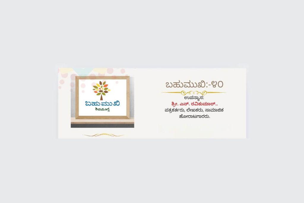 ಶಿವಮೊಗ್ಗ : ಬಹುಮುಖಿ ಶಿವಮೊಗ್ಗ ಇದರ ವತಿಯಿಂದ ಪತ್ರಕರ್ತ, ಲೇಖಕರು, ಸಾಮಾಜಿಕ ಹೋರಾಟಗಾರರಾದ ಶ್ರೀ ಎನ್. ರವಿಕುಮಾರ್ ಇವರಿಂದ ಉಪನ್ಯಾಸ ಕಾರ್ಯಕ್ರಮವನ್ನು ದಿನಾಂಕ 11 ಸೆಪ್ಟೆಂಬರ್ 2024ರಂದು ಸಂಜೆ 5-00 ಗಂಟೆಗೆ ಶಿವಮೊಗ್ಗದ ರಾಷ್ಟ್ರೀಯ ವಾಣಿಜ್ಯ ಕಾಲೇಜಿನ ಫ್ರೆಂಡ್ ಸೆಂಟರ್ ಇಲ್ಲಿ ಆಯೋಜಿಸಲಾಗಿದೆ.
