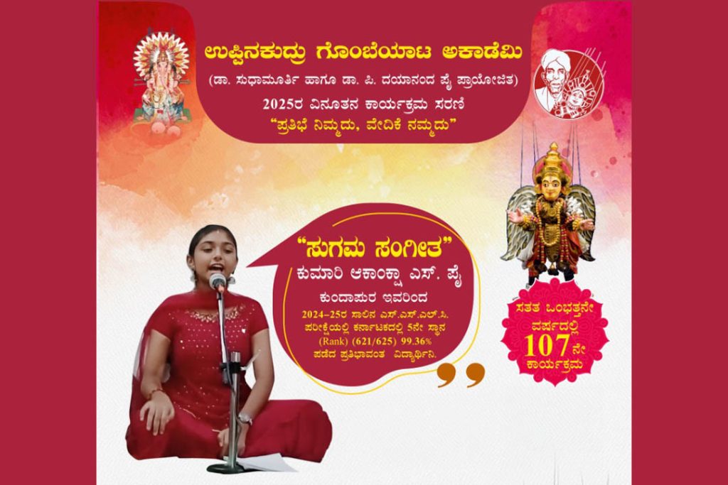 ಉಪ್ಪಿನಕುದ್ರು : ಉಪ್ಪಿನಕುದ್ರು ಗೊಂಬೆಯಾಟ ಅಕಾಡೆಮಿ ಇದರ ವತಿಯಿಂದ 2025ರ ವಿನೂತನ ಕಾರ್ಯಕ್ರಮ ಸರಣಿಯ ಮೇ ತಿಂಗಳ ಕಾರ್ಯಕ್ರಮದಲ್ಲಿ ಕುಮಾರಿ ಆಕಾಂಕ್ಷಾ ಎಸ್. ಪೈ ಕುಂದಾಪುರ ಇವರಿಂದ ‘ಸುಗಮ ಸಂಗೀತ’ ಕಾರ್ಯಕ್ರಮವನ್ನು ದಿನಾಂಕ 25 ಮೇ ಮಾರ್ಚ್ 2025ರಂದು ಸಂಜೆ ಗಂಟೆ 4-00ರಿಂದ ಉಪ್ಪಿನಕುದ್ರು ಗೊಂಬೆ ಮನೆಯಲ್ಲಿ ಹಮ್ಮಿಕೊಳ್ಳಲಾಗಿದೆ.