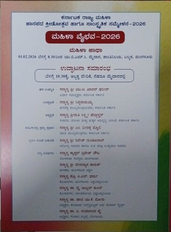 ಮಂಗಳೂರು : ಮಂಗಳೂರು ತಾಲೂಕು ಮಹಿಳಾ ಮಂಡಲಗಳ ಒಕ್ಕೂಟ (ರಿ.) ಅಶೋಕನಗರ, ಉರ್ವಸ್ಟೋರ್ ಮಂಗಳೂರು ಇದರ ವತಿಯಿಂದ ಕರ್ನಾಟಕ ರಾಜ್ಯ ಮಹಿಳಾ ಜಾನಪದ ಕ್ರೀಡೋತ್ಸವ ಹಾಗೂ ಸಾಂಸ್ಕೃತಿಕ ಸಮ್ಮೇಳನ ‘ಮಹಿಳಾ ವೈಭವ -2026’ ಕಾರ್ಯಕ್ರಮವನ್ನು ದಿನಾಂಕ 01 ಮತ್ತು 02 ಫೆಬ್ರುವರಿ 2026ರಂದು ಬೆಳಿಗ್ಗೆ 9-30 ಗಂಟೆಗೆ ಮಂಗಳೂರಿನ ನೆಹರು ಮೈದಾನ ಮತ್ತು ಕುದ್ಮುಲ್ ರಂಗರಾವ್ ಪುರಭವನದಲ್ಲಿ ಆಯೋಜಿಸಲಾಗಿದೆ.
