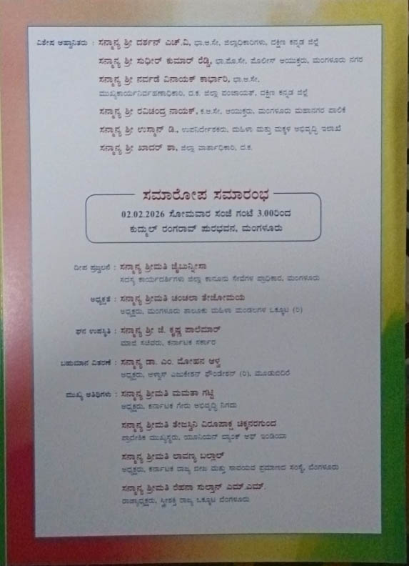 ದಿನಾಂಕ 02 ಫೆಬ್ರುವರಿ 2026ರಂದು ಸಂಜೆ 3-00 ಗಂಟೆಗೆ ಸಮಾರೋಪ ಸಮಾರಂಭ ನಡೆಯಲಿದ್ದು, ಸನ್ಮಾನ್ಯ ಜೈಜುನ್ನೀಸಾ ಇವರು ದೀಪ ಪ್ರಜ್ವಲನೆ ಮಾಡಲಿದ್ದು, ಮಂಗಳೂರು ತಾಲೂಕು ಮಹಿಳಾ ಮಂಡಲಗಳ ಒಕ್ಕೂಟದ ಅಧ್ಯಕ್ಷರಾದ ಸನ್ಮಾನ ಚಂಚಲಾ ತೇಜೋಮಯ ಇವರು ಅಧ್ಯಕ್ಷತೆ ವಹಿಸಲಿದ್ದಾರೆ. ಇದೇ ಸಂದರ್ಭದಲ್ಲಿ ಆಳ್ವಾಸ್ ಎಜುಕೇಶನ್ ಫೌಂಡೇಶನ್ ಇದರ ಅಧ್ಯಕ್ಷರಾದ ಡಾ. ಎಂ. ಮೋಹನ ಆಳ್ವ ಇವರು ವಿವಿಧ ಸ್ಪರ್ಧೆಗಳ ಬಹುಮಾನ ವಿತರಣೆ ಮಾಡಲಿದ್ದಾರೆ.