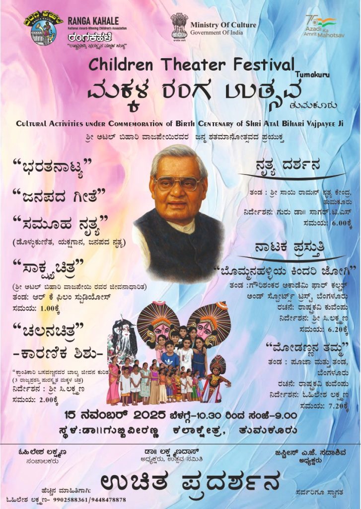 ತುಮಕೂರು : ರಾಷ್ಟ್ರಪ್ರಶಸ್ತಿ ಪುರಸ್ಕೃತ ಮಕ್ಕಳ ಸಂಸ್ಥೆ ‘ರಂಗಕಹಳೆ’ ಬೆಂಗಳೂರು ಇದರ ವತಿಯಿಂದ ಶ್ರೀ ಅಟಲ್ ಬಿಹಾರಿ ವಾಜಪೇಯಿಯವರ ಜನ್ಮ ಶತಮನೋತ್ಸವದ ಪ್ರಯುಕ್ತ ‘ಮಕ್ಕಳ ರಂಗ ಉತ್ಸವ’ವನ್ನು ದಿನಾಂಕ 15 ನವೆಂಬರ್ 2025ರಂದು ಬೆಳಗ್ಗೆ 10-30 ಗಂಟೆಗೆ ತುಮಕೂರಿನ ಡಾ. ಗುಬ್ಬಿ ವೀರಣ್ಣ ಕಲಾಕ್ಷೇತ್ರದಲ್ಲಿ ಹಮ್ಮಿಕೊಳ್ಳಲಾಗಿದೆ.