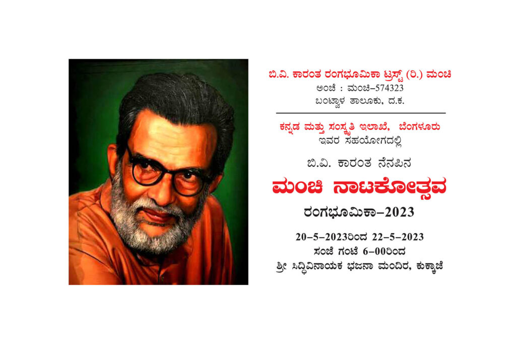 ಬಂಟ್ವಾಳ : ಬಿ.ವಿ. ಕಾರಂತ ರಂಗಭೂಮಿಕಾ ಟ್ರಸ್ಟ್ (ರಿ.) ಮಂಚಿ ಹಾಗೂ ಕನ್ನಡ ಮತ್ತು ಸಂಸ್ಕೃತಿ ಇಲಾಖೆ, ಬೆಂಗಳೂರು ಇವರ ಸಹಯೋಗದಲ್ಲಿ ಬಿ.ವಿ. ಕಾರಂತ ನೆನಪಿನ ‘ಮಂಚಿ ನಾಟಕೋತ್ಸವ’ ರಂಗ ಭೂಮಿಕಾ -2023 ದಿನಾಂಕ 20-05-2023ರಿಂದ 22-05-2023ರವರೆಗೆ ಶ್ರೀ ಸಿದ್ಧಿವಿನಾಯಕ ಭಜನಾ ಮಂದಿರ, ಕುಕ್ಕಾಜೆ ಇಲ್ಲಿ ನಡೆಯಲಿದೆ.