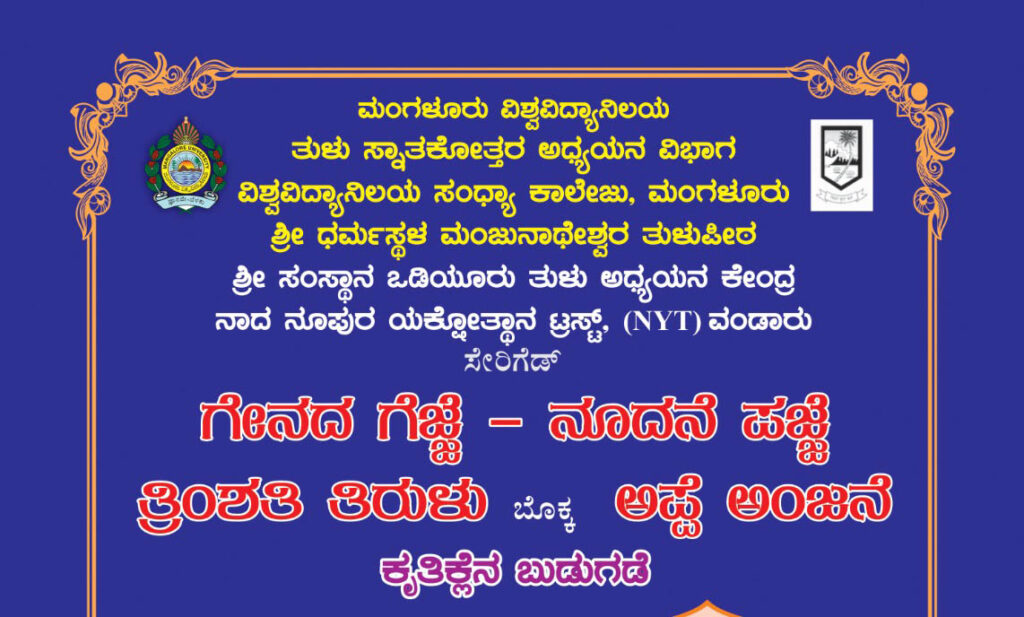 ಮಂಗಳೂರು : ಮಂಗಳೂರು ವಿಶ್ವವಿದ್ಯಾನಿಲಯ, ತುಳು ಸ್ನಾತಕೋತ್ತರ ಅಧ್ಯಯನ ವಿಭಾಗ, ವಿಶ್ವವಿದ್ಯಾನಿಲಯ ಸಂಧ್ಯಾ ಕಾಲೇಜು ಮಂಗಳೂರು, ಶ್ರೀ ಧಮಸ್ಥಳ ಮಂಜುನಾಥೇಶ್ವರ ತುಳುಪೀಠ, ಶ್ರೀ ಸಂಸ್ಥಾನ ಒಡಿಯೂರು ತುಳು ಅಧ್ಯಯನ ಕೇಂದ್ರ ಮತ್ತು ನಾದ ನೂಪುರ ಯಕ್ಷೋತ್ಥಾನ ಟ್ರಸ್ಟ್ ವಂಡಾರು ಇವರ ಸಹಯೋಗದೊಂದಿಗೆ “ಗೇನದ ಗೆಜ್ಜೆ – ನೂದನೆ ಪಜ್ಜೆ’ ಹಾಗೂ ‘ತ್ರಿಂಶತಿ ತಿರುಳು’ ಮತ್ತು ‘ಅಪ್ಪೆ ಅಂಜನೆ’ ಕೃತಿ ಬಿಡುಗಡೆ ಕಾರ್ಯಕ್ರಮವು ದಿನಾಂಕ :01-06-2023ರಂದು ಮಂಗಳೂರು ವಿಶ್ವವಿದ್ಯಾನಿಲಯ ಕಾಲೇಜಿನ ರವೀಂದ್ರ ಕಲಾಭವನದಲ್ಲಿ ನಡೆಯಲಿದೆ.