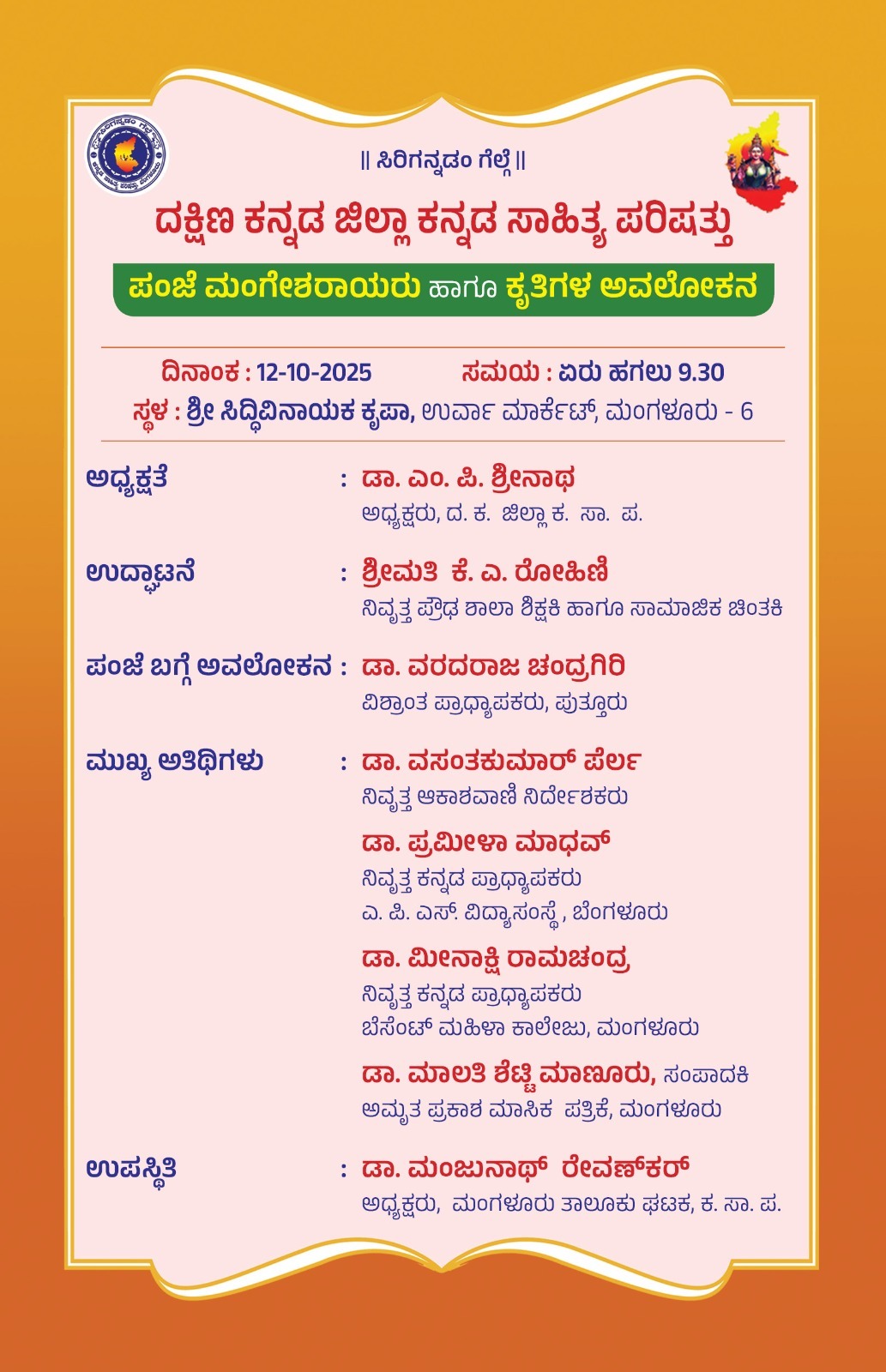 ದ. ಕ. ಜಿಲ್ಲಾ ಕ. ಸಾ. ಪ. ದಿಂದ ‘ಮಂಗೇಶರಾಯರು ಹಾಗೂ ಕೃತಿಗಳ ಅವಲೋಕನ’ ಕಾರ್ಯಕ್ರಮ | ಅಕ್ಟೋಬರ್ 10