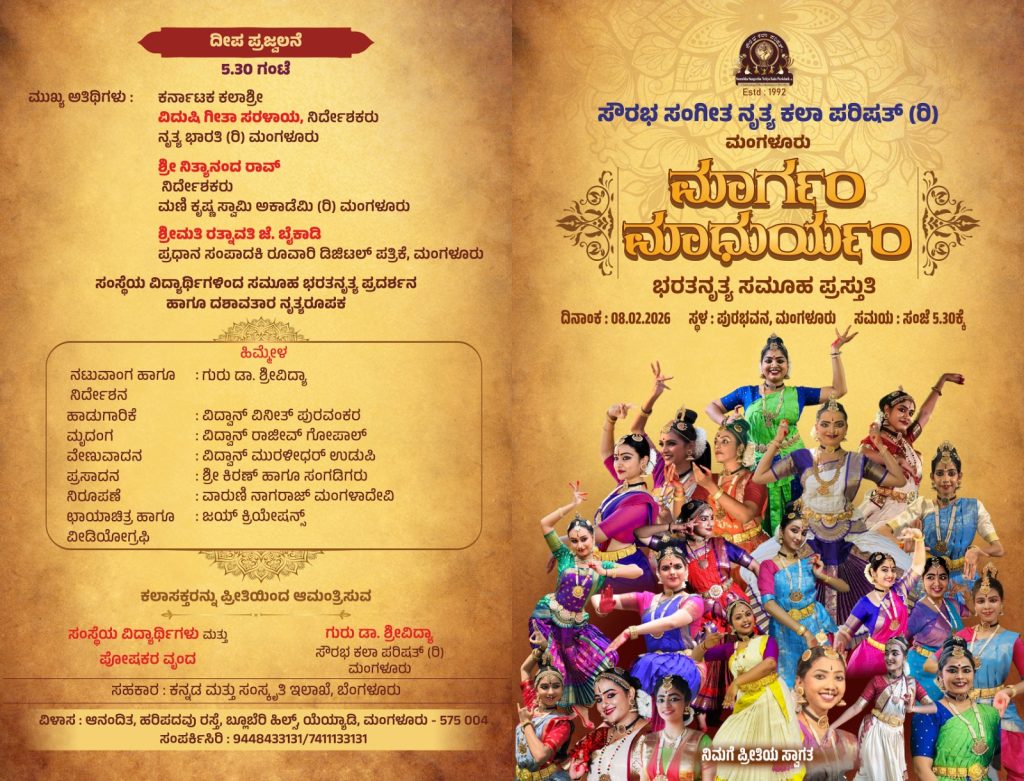 ಮಂಗಳೂರು : ಸೌರಭ ಸಂಗೀತ ನೃತ್ಯ ಕಲಾ ಪರಿಷತ್ (ರಿ.) ಮಂಗಳೂರು ಪ್ರಸ್ತುತ ಪಡಿಸುವ ‘ಮಾರ್ಗಂ ಮಾಧುರ್ಯಂ’ ಭರತನೃತ್ಯ ಸಮೂಹ ಪ್ರಸ್ತುತಿಯನ್ನು ದಿನಾಂಕ 08 ಫೆಬ್ರವರಿ 2026ರಂದು ಸಂಜೆ 5-30 ಗಂಟೆಗೆ ಮಂಗಳೂರಿನ ಪುರಭವನದಲ್ಲಿ ಹಮ್ಮಿಕೊಳ್ಳಲಾಗಿದೆ.