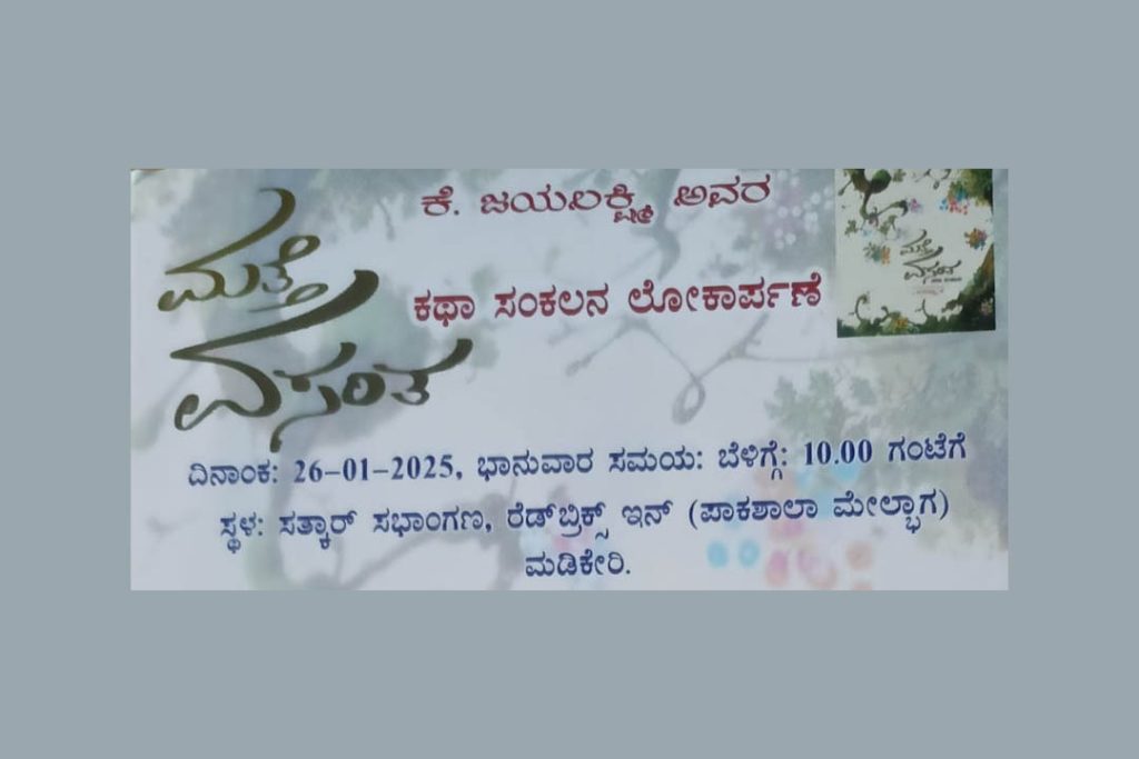 ಮಡಿಕೇರಿ : ಉಪನ್ಯಾಸಕಿ ಮತ್ತು ಲೇಖಕಿಯಾದ ಶ್ರೀಮತಿ ಜಯಲಕ್ಷ್ಮೀ ಇವರು ಬರೆದಿರುವ ‘ಮತ್ತೆ ವಸಂತ’ ಕಥಾ ಸಂಕಲನದ ಲೋಕರ್ಪಣಾ ಸಮಾರಂಭವು ದಿನಾಂಕ 26 ಜನವರಿ 2025ರಂದು ರಂದು ಮಡಿಕೇರಿಯ ರೆಡ್ ಬ್ರಿಕ್ಸ್ ಇನ್ (ಪಾಕಶಾಲಾ ಮೇಲ್ಭಾಗ )ಸಭಾಂಗಣದಲ್ಲಿ ಬೆಳಗ್ಗೆ ಘಂಟೆ 10.00ಕ್ಕೆ ನಡೆಯಲಿದೆ.