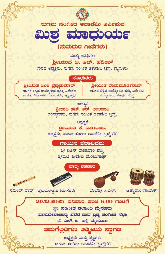 ಮೈಸೂರು : ಸುಗಮ ಸಂಗೀತ ಅಕಾಡೆಮಿ ಅರ್ಪಿಸುವ ‘ಮಿಶ್ರ ಮಾಧುರ್ಯ’ ಸುಮಧುರ ಗೀತೆಗಳ ಗಾಯನ ಕಾರ್ಯಕ್ರಮವನ್ನು ದಿನಾಂಕ 20 ಡಿಸೆಂಬರ್ 2025ರಂದು ಸಂಜೆ 6-00 ಗಂಟೆಗೆ ಮೈಸೂರು ಜೆ.ಎಲ್.ಬಿ. ರಸ್ತೆಯಲ್ಲಿರುವ ಸಂಗೀತ ಕಲಾನಿಧಿ ಮೈಸೂರು ವಾಸುದೇವಾಚಾರ್ಯ ಭವನ ನಾದ ಬ್ರಹ್ಮ ಸಂಗೀತ ಸಭಾದಲ್ಲಿ ಹಮ್ಮಿಕೊಳ್ಳಲಾಗಿದೆ.