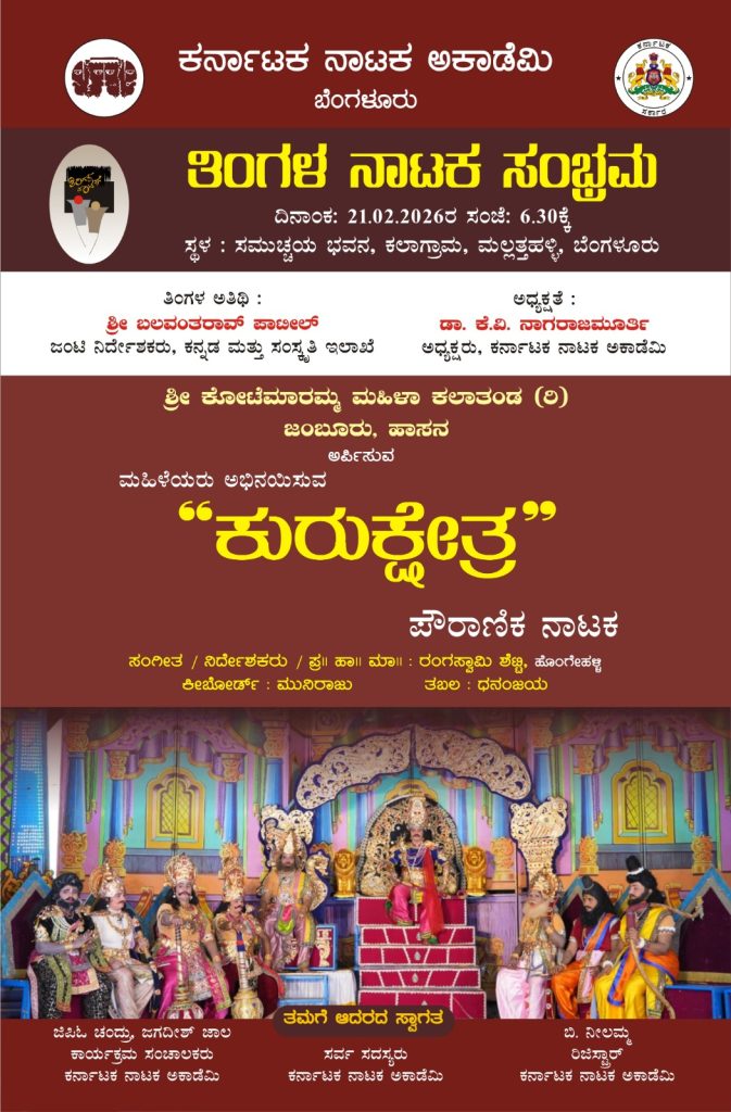 ಬೆಂಗಳೂರು : ಕರ್ನಾಟಕ ನಾಟಕ ಅಕಾಡೆಮಿ ಬೆಂಗಳೂರು ಇವರ ವತಿಯಿಂದ ನಡೆಯುವ ‘ತಿಂಗಳ ನಾಟಕ ಸಂಭ್ರಮ’ದ ಕಾರ್ಯಕ್ರಮವನ್ನು ದಿನಾಂಕ 21 ಫೆಬ್ರವರಿ 2026ರಂದು ಸಂಜೆ 6-30 ಗಂಟೆಗೆ ಬೆಂಗಳೂರಿನ ಮಲ್ಲತ್ತಹಳ್ಳಿಯ ಕಲಾಗ್ರಾಮದ ಸಮುಚ್ಚಯ ಭವನದಲ್ಲಿ ಹಮ್ಮಿಕೊಳ್ಳಲಾಗಿದೆ.