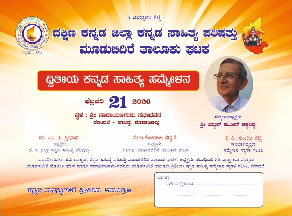 ಮೂಡುಬಿದಿರೆ : ದಕ್ಷಿಣ ಕನ್ನಡ ಜಿಲ್ಲಾ ಕನ್ನಡ ಸಾಹಿತ್ಯ ಪರಿಷತ್ತು ಮೂಡುಬಿದಿರೆ ತಾಲೂಕು ಘಟಕ ದ್ವಿತೀಯ ಕನ್ನಡ ಸಾಹಿತ್ಯ ಸಮ್ಮೇಳನವನ್ನು ದಿನಾಂಕ 21 ಫೆಬ್ರವರಿ 2026ರಂದು ಕಡಂದಲೆ ಪಾಲಡ್ಕ ಪೂಪಾಡಿಕಲ್ಲು ಇಲ್ಲಿರುವ ಶ್ರೀ ನಾರಾಯಣಗುರು ಸಭಾಭವನದಲ್ಲಿ ಆಯೋಜಿಸಲಾಗಿದೆ.