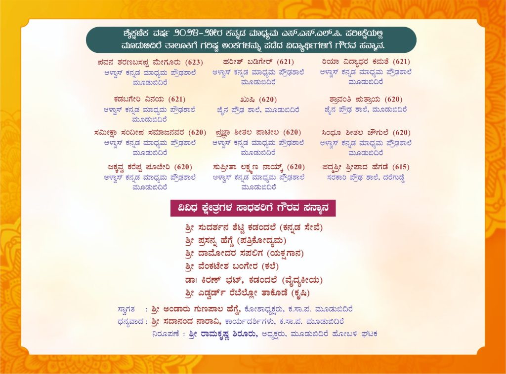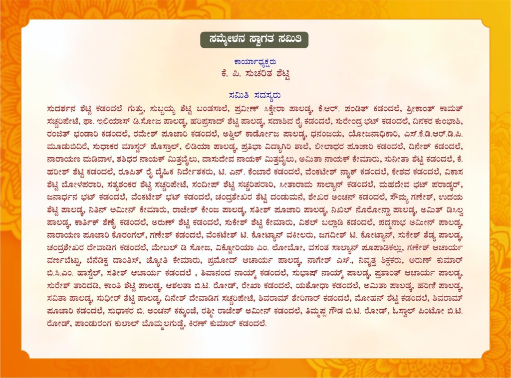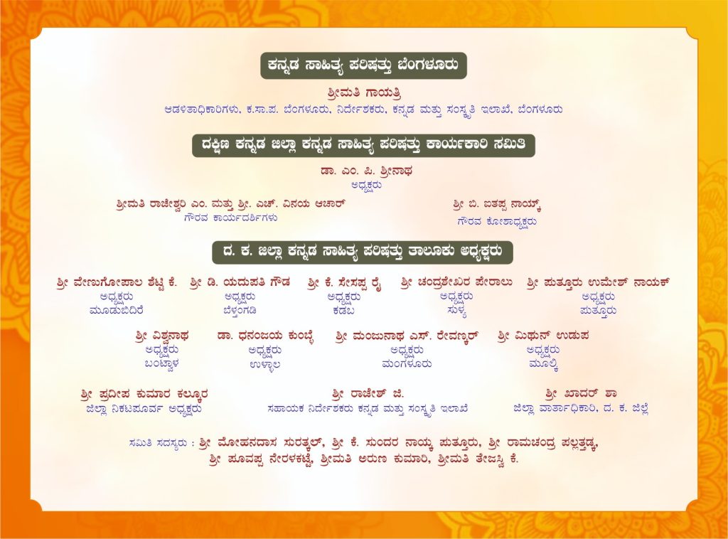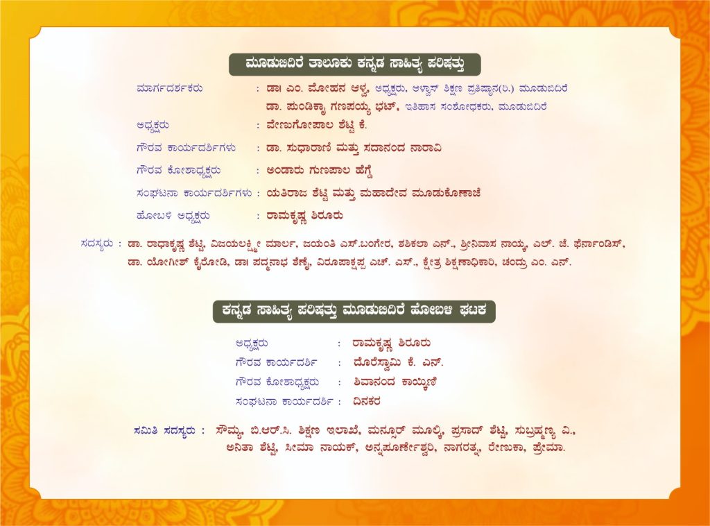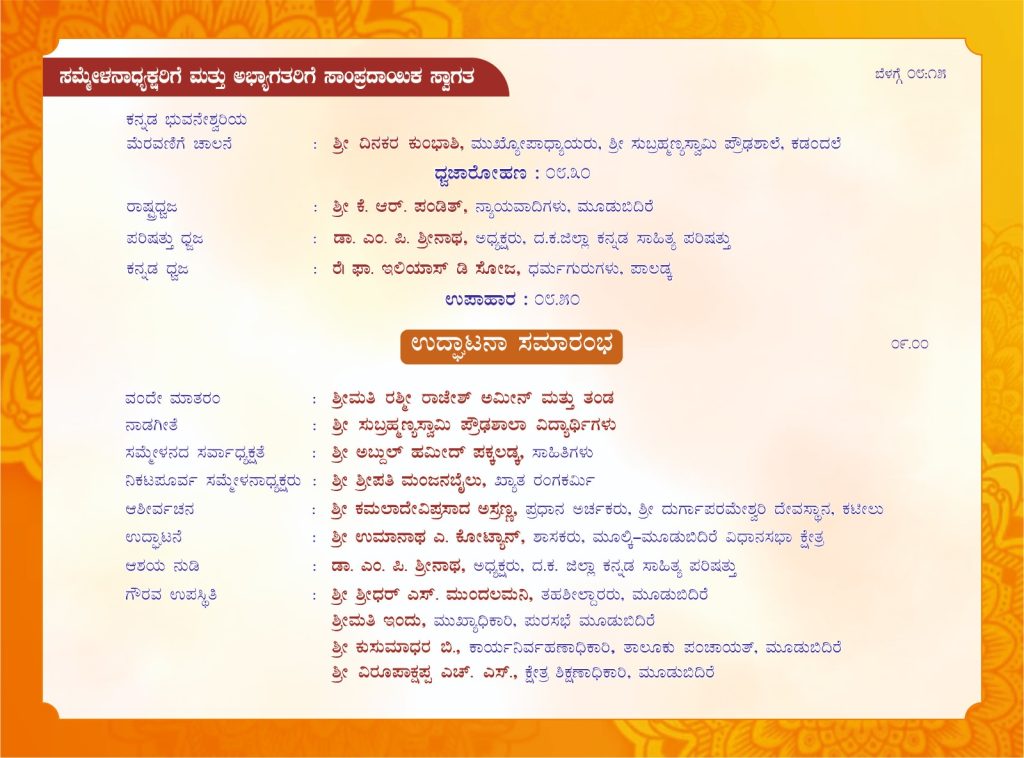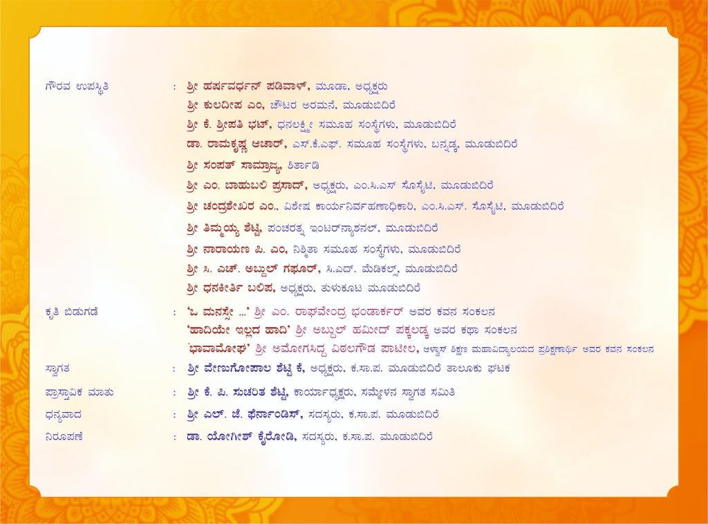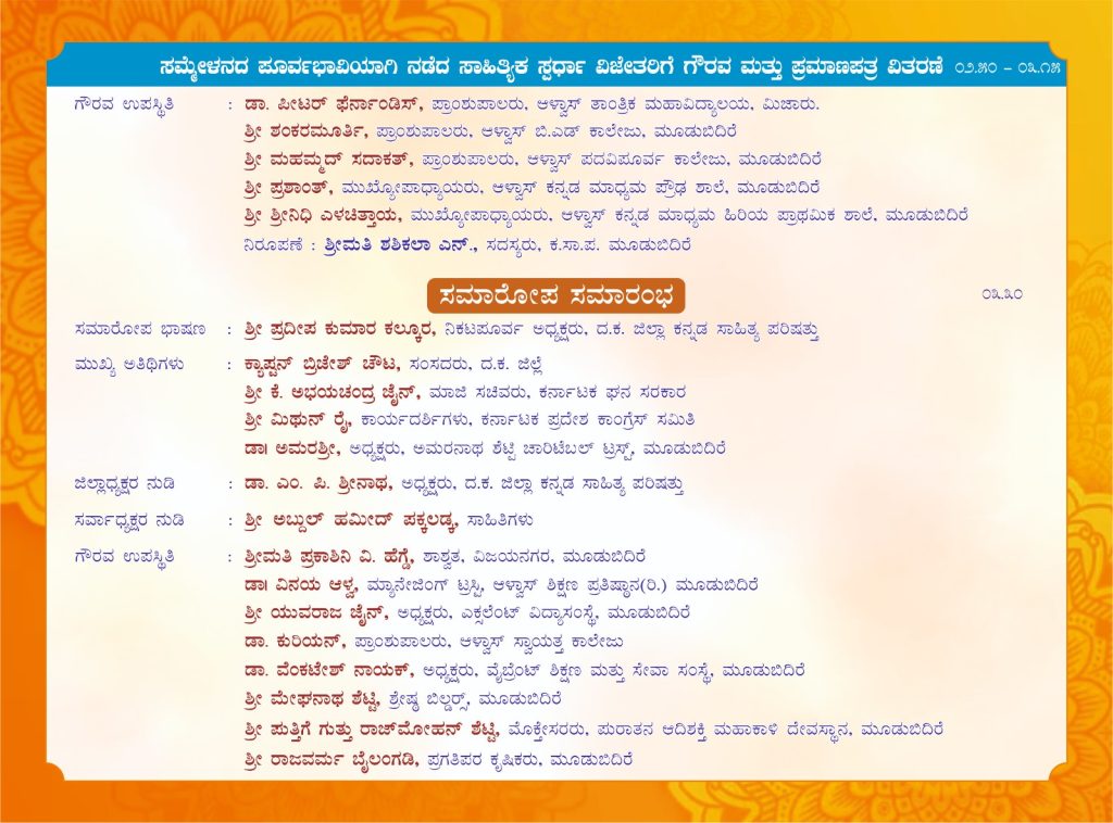 ಬೆಳಗ್ಗೆ 9-00 ಗಂಟೆಗೆ ಸಾಹಿತಿ ಅಬ್ದುಲ್ ಹಮೀದ್ ಪಕ್ಕಲಡ್ಕ ಇವರ ಸಮ್ಮೇಳನಾಧ್ಯಕ್ಷತೆಯಲ್ಲಿ ನಡೆಯುವ ಈ ಸಾಹಿತ್ಯ ಸಮ್ಮೇಳನವನ್ನು ಶಾಸಕರಾದ ಉಮಾನಾಥ ಎ. ಕೋಟ್ಯಾನ್ ಇವರ ಉದ್ಘಾಟಿಸಲಿದ್ದಾರೆ. ಎಂ. ರಾಘವೇಂದ್ರ ಭಂಡಾರ್ಕರ್ ಉವಾರ ‘ಓ ಮನಸ್ಸೇ’ ಕವನ ಸಂಕಲನ, ಅಬ್ದುಲ್ ಹಮೀದ್ ಪಕ್ಕಲಡ್ಕ ಇವರ ‘ಹಾದಿಯೇ ಇಲ್ಲದ ಹಾದಿ’ ಹಾಗೂ ಅಮೋಗಸಿದ್ದ ವಿಠಲಗೌಡ ಪಾಟೀಲ ಇವರ ‘ಭಾವಾಮೋಘ’ ಕೃತಿಗಳು ಲೋಕಾರ್ಪಣೆಗೊಳ್ಳಲಿದೆ. ಆಳ್ವಾಸ್ ಸ್ವಾಯತ್ತ ಪದವಿ ಕಾಲೇಜು ವಿದ್ಯಾರ್ಥಿಗಳಿಂದ ಸಾಂಸ್ಕೃತಿಕ ವೈಭವ ಪ್ರಸ್ತುತಗೊಳ್ಳಲಿದೆ. ‘ಶಿಕ್ಷಣ ಮತ್ತು ರಂಗಭೂಮಿ’ ಎಂಬ ವಿಷಯದ ಬಗ್ಗೆ ಜೀವನ್ ರಾಂ ಸುಳ್ಯ ಇವರು ವಿಶೇಷೋಪನ್ಯಾಸ ನೀಡಲಿದ್ದಾರೆ. ಧವಲಾ ಕಾಲೇಜಿನ ವಿದ್ಯಾರ್ಥಿಗಳಿಂದ ಭಾವಗಾನ, ‘ಶಿಕ್ಷಣ ಮತ್ತು ಸಂಸ್ಕೃತಿ’ ಎಂಬ ವಿಷಯದ ಬಗ್ಗೆ ಶ್ರೀಮತಿ ಶ್ವೇತಾ ಜೈನ್ ಇವರು ವಿಶೇಷೋಪನ್ಯಾಸ ನೀಡಲಿದ್ದಾರೆ. ಸಂಜೆ ನಡೆಯಲಿರುವ ಸಮಾರೋಪ ಸಮಾರಂಭದಲ್ಲಿ ಕ.ಸಾ.ಪ.ದ ನಿಕಟ ಪೂರ್ವ ಅಧ್ಯಕ್ಷರಾದ ಪ್ರದೀಪ ಕುಮಾರ ಕಲ್ಕೂರ ಇವರು ಸಮಾರೋಪ ಭಾಷಣ ಮಾಡಲಿದ್ದಾರೆ.