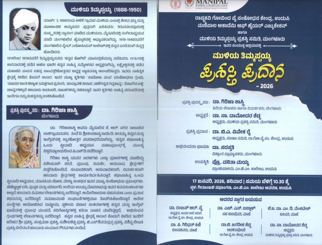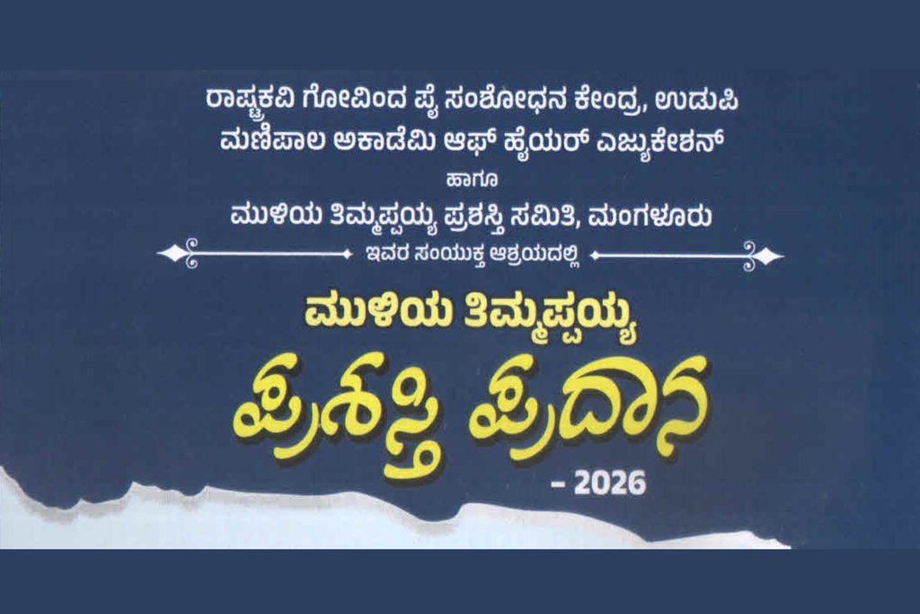 ಉಡುಪಿ : ರಾಷ್ಟ್ರಕವಿ ಗೋವಿಂದ ಪೈ ಸಂಶೋಧನ ಕೇಂದ್ರ ಉಡುಪಿ, ಮಣಿಪಾಲ ಅಕಾಡೆಮಿ ಆಫ್ ಹೈಯರ್ ಎಜ್ಯುಕೇಶನ್ ಹಾಗೂ ಮುಳಿಯ ತಿಮ್ಮಪ್ಪಯ್ಯ ಪ್ರಶಸ್ತಿ ಸಮಿತಿ ಮಂಗಳೂರು ಇವರ ಸಂಯುಕ್ತ ಆಶ್ರಯದಲ್ಲಿ ‘ಮುಳಿಯ ತಿಮ್ಮಪ್ಪಯ್ಯ ಪ್ರಶಸ್ತಿ’ ಪ್ರದಾನ ಕಾರ್ಯಕ್ರಮವು ದಿನಾಂಕ 17 ಜನವರಿ 2026ರ ಶನಿವಾರದಂದು ಬೆಳಗ್ಗೆ 10-30 ಗಂಟೆಗೆ ಉಡುಪಿ ಎಂ.ಜಿ.ಎಂ. ಕಾಲೇಜಿನ ಆವರಣದಲ್ಲಿರುವ ಗೀತಾಂಜಲಿ ಸಭಾಂಗಣದಲ್ಲಿ ನಡೆಯಲಿದೆ.