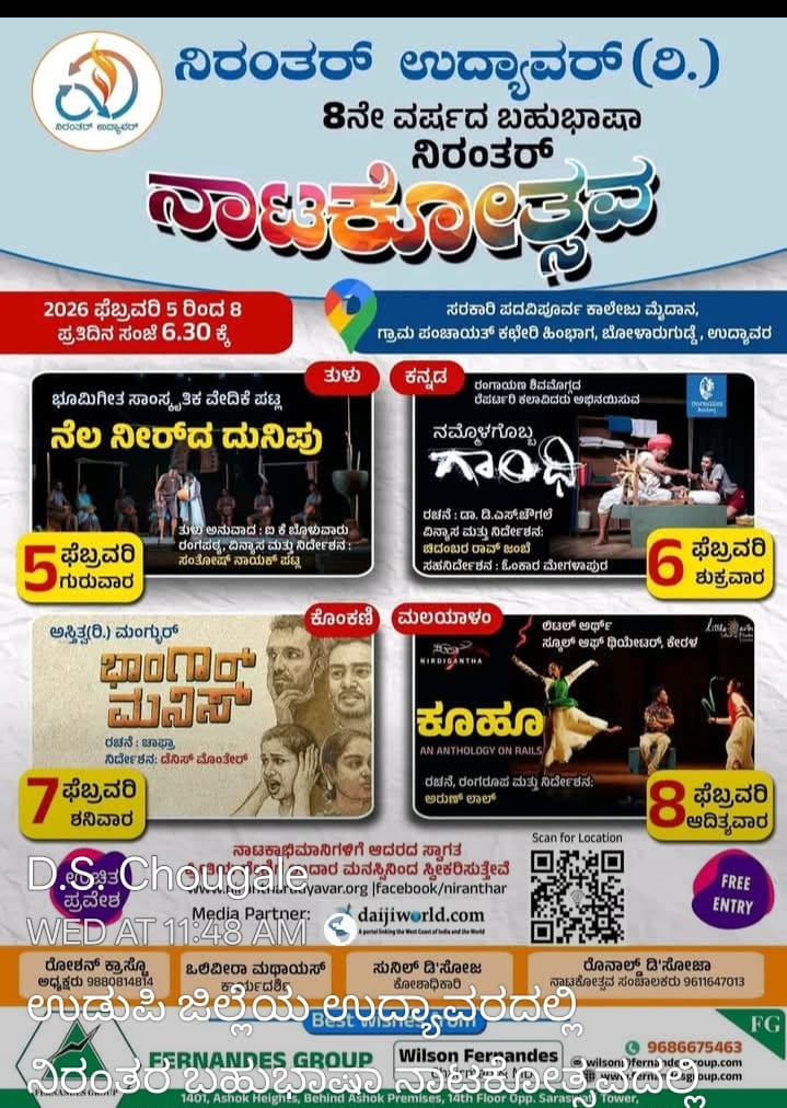 ಉದ್ಯಾವರ : ನಿರಂತರ್ ಉದ್ಯಾವರ್ (ರಿ.) ಇವರ ವತಿಯಿಂದ 8ನೇ ವರ್ಷದ ಬಹುಭಾಷಾ ನಿರಂತರ್ ನಾಟಕೋತ್ಸವವನ್ನು ದಿನಾಂಕ 05ರಿಂದ 08 ಫೆಬ್ರವರಿ 2026ರವರೆಗೆ ಪ್ರತಿದಿನ ಸಂಜೆ 6-30 ಗಂಟೆಗೆ ಉದ್ಯಾವರದ ಸರಕಾರಿ ಪದವಿ ಪೂರ್ವ ಕಾಲೇಜಿನ ಮೈದಾನದಲ್ಲಿ ಆಯೋಜಿಸಲಾಗಿದೆ.