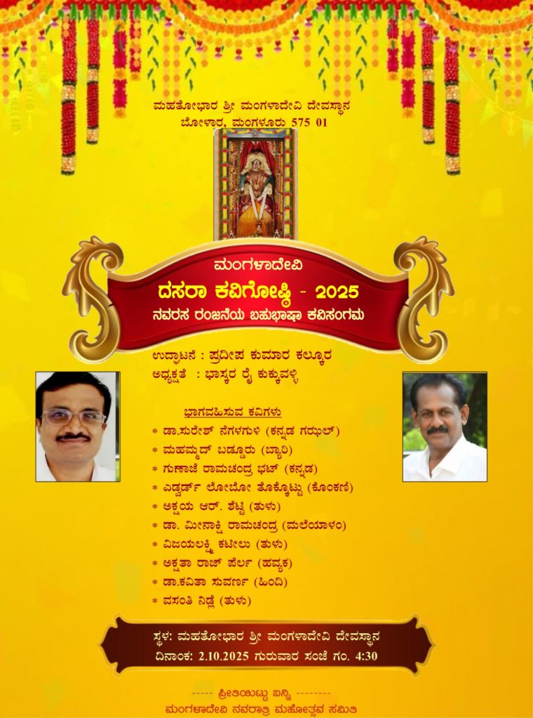 ಮಂಗಳೂರು : ಶರನ್ನವರಾತ್ರಿ ಪ್ರಯುಕ್ತ ಮಹತೋಭಾರ ಶ್ರೀ ಮಂಗಳಾದೇವಿ ದೇವಸ್ಥಾನದಲ್ಲಿ ಸೆಪ್ಟೆಂಬರ್ 22ರಿಂದ ಮೊದಲ್ಗೊಂಡು ನವರಾತ್ರಿ ಮಹೋತ್ಸವ ವಿವಿಧ ಧಾರ್ಮಿಕ ಮತ್ತು ಸಾಂಸ್ಕೃತಿಕ ಕಾರ್ಯಕ್ರಮಗಳೊಂದಿಗೆ ನಡೆಯುತ್ತಿದೆ. ಈ ಸಂದರ್ಭದಲ್ಲಿ ದಿನಾಂಕ 02 ಅಕ್ಟೋಬರ್ 2025 ಗುರುವಾರ ವಿಜಯದಶಮಿಯಂದು ಸಾಯಂಕಾಲ 4-30 ಗಂಟೆಗೆ ‘ದಸರಾ ಕವಿಗೋಷ್ಠಿ – 2025’ ನವರಸ ರಂಜನೆಯ ಬಹುಭಾಷಾ ಕವಿಗೋಷ್ಠಿಯನ್ನು ಏರ್ಪಡಿಸಲಾಗಿದೆ.