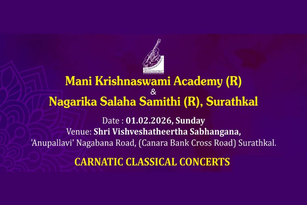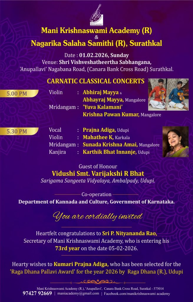 ಮಂಗಳೂರು : ಮಣಿ ಕೃಷ್ಣಸ್ವಾಮಿ ಅಕಾಡೆಮಿ (ರಿ.) ಮತ್ತು ಸುರತ್ಕಲ್ ನಾಗರಿಕ ಸಲಹಾ ಸಮಿತಿ ಸಂಸ್ಥೆಗಳ ಆಶ್ರಯದಲ್ಲಿ ದಿನಾಂಕ 01 ಫೆಬ್ರುವರಿ 2026ರಂದು ಭಾನುವಾರ ಸಂಜೆ 5-00 ಗಂಟೆಗೆ ಸುರತ್ಕಲ್ನ ಶ್ರೀ ವಿಶ್ವೇಶತೀರ್ಥ ಸಭಾಂಗಣದಲ್ಲಿ ಎರಡು ಸಂಗೀತ ಕಛೇರಿಯನ್ನು ಆಯೋಜಿಸಲಾಗಿದೆ.