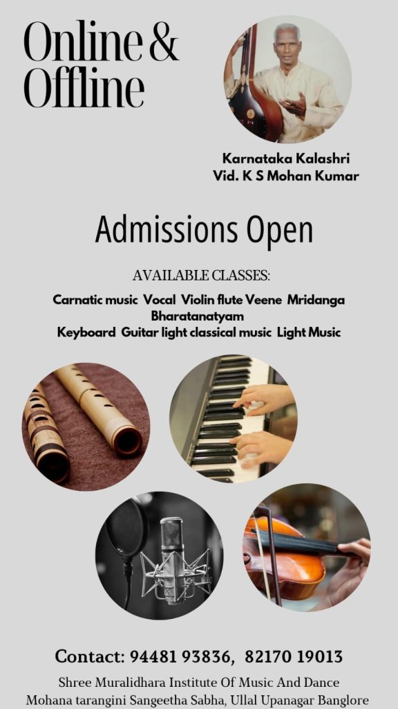ಬೆಂಗಳೂರು : ಶ್ರೀ ಮುರಳೀಧರ ಸಂಗೀತ ನೃತ್ಯ ಮಹಾವಿದ್ಯಾಲಯ (ರಿ.) ಹಾಗೂ ಮೋಹನ ತರಂಗಿಣಿ ಸಂಗೀತ ಸಭಾ ಇದರ ವತಿಯಿಂದ ರಾಜ್ಯಾದ್ಯಂತ ಹಾಗೂ ಬೆಂಗಳೂರಿನ ನಾನಾ ಬಡಾವಣೆಗಳಲ್ಲಿ ಆಫ್ ಲೈನ್ ಮತ್ತು ಆನ್ ಲೈನ್ ಸಂಗೀತ ನೃತ್ಯ ತರಗತಿಗಳು ನಡೆಯಲಿದೆ. ಶಾಸ್ತ್ರೀಯ ಸಂಗೀತ, ಸುಗಮ ಸಂಗೀತ, ದೇವರನಾಮ, ವಚನ ಗಾಯನ, ಭರತನಾಟ್ಯ, ಕೀಬೋರ್ಡ್, ವಯೋಲಿನ್, ಕೊಳಲು, ವೀಣೆ, ಮೃದಂಗ ಹಾಗೂ ವಾದ್ಯ ಸಂಗೀತದಲ್ಲಿ ಜೂನಿಯರ್, ಸೀನಿಯರ್, ವಿದ್ವತ್ ಪರೀಕ್ಷೆಗಳಿಗೆ ತರಬೇತಿ ಹಾಗೂ ಅಂಗವಿಕಲ, ಬಡ ಮಕ್ಕಳಿಗೆ ಉಚಿತ ಶಿಕ್ಷಣ ನೀಡಲಾಗುವುದು. ಹೆಚ್ಚಿನ ಮಾಹಿತಿಗಾಗಿ 94481 93836 ಮತ್ತು 82170 19013 ಸಂಖ್ಯೆಯನ್ನು ಸಂಪರ್ಕಿಸಿರಿ.