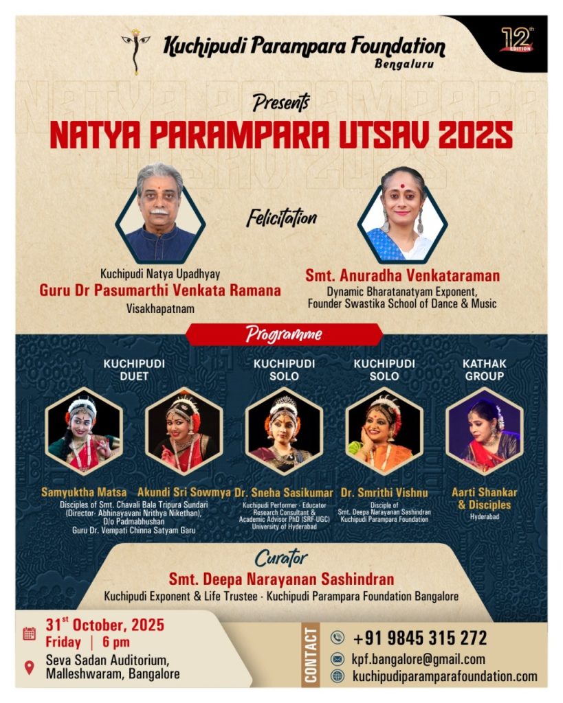 ಇದೀಗ ‘ನಾಟ್ಯ ಪರಂಪರ’ ಹನ್ನೆರಡನೆಯ ನೃತ್ಯೋತ್ಸವ – 2025ರ ಸಂಭ್ರಮಾಚರಣೆ ದಿನಾಂಕ 31 ಅಕ್ಟೋಬರ್ 2025ರ ಶುಕ್ರವಾರ ಸಂಜೆ 6-00 ಗಂಟೆಗೆ ಬೆಂಗಳೂರಿನ ಮಲ್ಲೇಶ್ವರದ ಸೇವಾಸದನ ಸಭಾಂಗಣದಲ್ಲಿ ವಿಜ್ರುಂಭಣೆಯಿಂದ ನಡೆಯಲಿದೆ. ವಿಶಾಖಪಟ್ಟಣದ ಸಾಂಪ್ರದಾಯಕ ಕುಚಿಪುಡಿ ಕುಟುಂಬದ ಹಿರಿಯ ಕುಚಿಪುಡಿ ಗುರು ಡಾ. ಪಸುಮರ್ತಿ ವೆಂಕಟರಮಣ ಮತ್ತು ಶ್ರೀಮತಿ ಅನುರಾಧಾ ವೆಂಕಟರಮಣನ್ – ಭರತನಾಟ್ಯ ನೃತ್ಯಜ್ಞೆ – ಬೆಂಗಳೂರು, ಇವರುಗಳ ಕಲಾಸೇವೆಯನ್ನು ಗುರುತಿಸಿ, ಕಾರ್ಯಕ್ರಮದಲ್ಲಿ ಇವರನ್ನು ಸನ್ಮಾನಿಸಲಾಗುವುದು. ನಂತರ ನೃತ್ಯ ಕಲಾವಿದೆ ಸಂಯುಕ್ತ ಮತ್ಸ ಮತ್ತು ಹೈದರಾಬಾದಿನ ಆಕುಂಡಿ ಶ್ರೀ ಸೌಮ್ಯ (ಪದ್ಮಭೂಷಣ ಗುರು ಡಾ. ವೆಂಪಟಿ ಚಿನ್ನಸತ್ಯಂ ಅವರ ಮಗಳಾದ ಶ್ರೀಮತಿ ಬಾಲ ತ್ರಿಪುರಸುಂದರಿ ಅವರ ಶಿಷ್ಯೆಯರು) ಇವರಿಂದ ಕೂಚಿಪುಡಿ ಯುಗಳ ನೃತ್ಯ ಪ್ರದರ್ಶನ, ಕೇರಳದ ಡಾ. ಸ್ನೇಹ ಶಶಿಕುಮಾರ್ ಮತ್ತು ಕೂಚಿಪುಡಿ ನೃತ್ಯಜ್ಞೆ ದೀಪಾ ಶಶೀಂದ್ರನ್ ಶಿಷ್ಯೆಯಾದ ಬೆಂಗಳೂರಿನ ಡಾ. ಸ್ಮೃತಿ ವಿಷ್ಣು ಇವರಿಂದ ಕೂಚಿಪುಡಿ ಏಕವ್ಯಕ್ತಿ ನೃತ್ಯ ಪ್ರದರ್ಶನ ಹಾಗೂ ಹೈದರಾಬಾದಿನ ಆರತಿ ಶಂಕರ್ ಮತ್ತು ಅವರ ಶಿಷ್ಯೆಯರಿಂದ ಕಥಕ್ ನೃತ್ಯ ಪ್ರದರ್ಶನಗಳನ್ನು ಆಯೋಜಿಸಲಾಗಿದೆ.