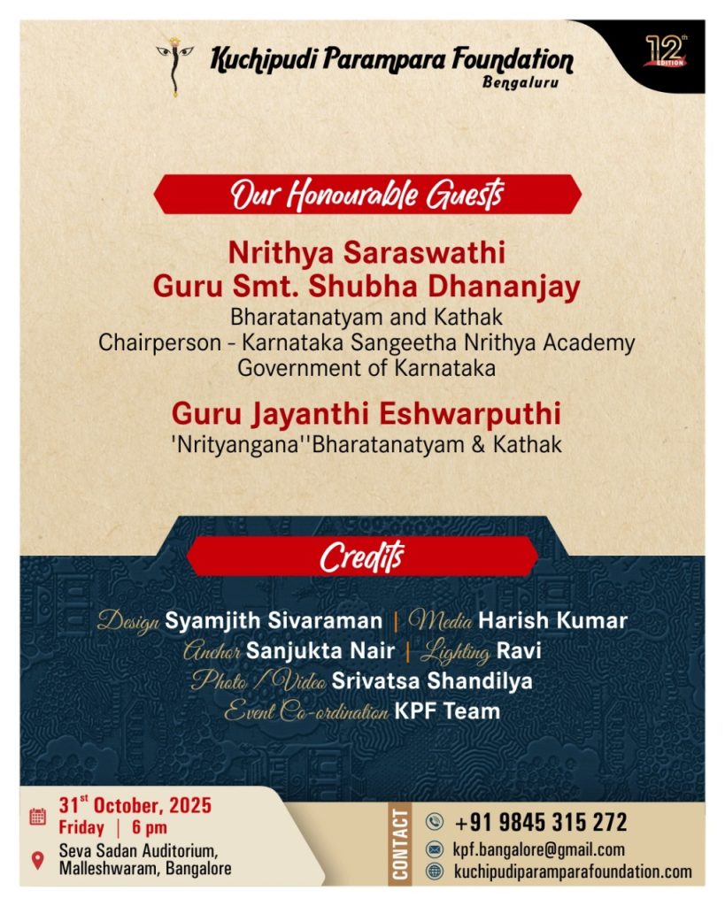 ಕಾರ್ಯಕ್ರಮದಲ್ಲಿ ಕರ್ನಾಟಕ ಸಂಗೀತ -ನೃತ್ಯ ಅಕಾಡೆಮಿಯ ಅಧ್ಯಕ್ಷೆ ಶ್ರೀಮತಿ ಶುಭಾ ಧನಂಜಯ ಮತ್ತು ಗುರು ಜಯಂತಿ ಈಶ್ವರಪುತಿ ಮುಖ್ಯ ಅತಿಥಿಗಳಾಗಿ ಭಾಗವಹಿಸುವರು. ಈ ನಯನ ಮನೋಹರವಾದ ಕಾರ್ಯಕ್ರಮವನ್ನು ಬೆಂಗಳೂರಿನ ಕೆ.ಪಿ.ಎಫ್. ಲೈಫ್ ಟ್ರಸ್ಟಿ, ಕೂಚಿಪುಡಿ ನೃತ್ಯಜ್ಞೆ ಆಚಾರ್ಯ ದೀಪಾ ಶಶೀಂದ್ರನ್ ಆಯೋಜಿಸಿದ್ದಾರೆ. ಬೆಂಗಳೂರಿನ ಈ ಕೂಚಿಪುಡಿ ಪರಂಪರ ಫೌಂಡೇಷನ್ ಒಂದು ಲಾಭರಹಿತ ಪ್ರತಿಷ್ಠಾನವಾಗಿದ್ದು, ಇದರ ಲೈಫ್ ಟ್ರಸ್ಟಿಯಾದ ಕೂಚಿಪುಡಿ ನೃತ್ಯಜ್ಞೆ ದೀಪಾ ಶಶೀಂದ್ರನ್ ಜಾಗತಿಕ ಮಟ್ಟದಲ್ಲಿ ಅತ್ಯಂತ ಪ್ರತಿಭಾನ್ವಿತ ಕಲಾವಿದರನ್ನು ಒಗ್ಗೂಡಿಸಿ, ಇವರಿಗೆ ವ್ಯವಸ್ಥಿತ ಕೂಚಿಪುಡಿ ನೃತ್ಯ ತರಬೇತಿ ಮತ್ತು ನೃತ್ಯ ಸಂಯೋಜನೆಯನ್ನು ಬದ್ಧತೆಯಿಂದ ಕಲಿಸಿಕೊಡುವ ಅವಿರತ ಕೈಂಕರ್ಯ ಕೈಗೊಂಡಿದ್ದಾರೆ. ಹೆಚ್ಚಿನ ಮಾಹಿತಿಗಾಗಿ [email protected]/ 9845315272. www.kuchipudiparamparafoundation.com , Kuchipudiparamaparafoundation youtubchannel, ಇವರನ್ನು ಸಂಪರ್ಕಿಸಬಹುದು.
