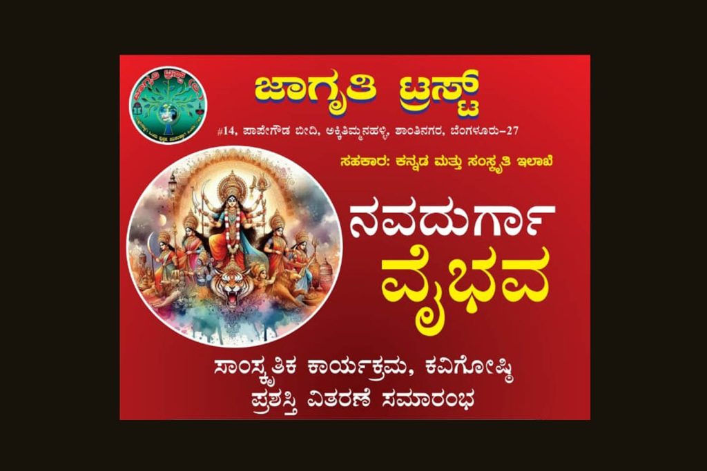 ಬೆಂಗಳೂರು : ಜಾಗೃತಿ ಟ್ರಸ್ಟ್ (ರಿ.) ಬೆಂಗಳೂರು ಇದರ ವತಿಯಿಂದ ಹಾಗೂ ಕನ್ನಡ ಮಟ್ಟಿ ಸಂಸ್ಕೃತಿ ಇಲಾಖೆ ಇವರ ಸಹಕಾರದೊಂದಿಗೆ ‘ನವದುರ್ಗಾ ವೈಭವ’ ಸಾಂಸ್ಕೃತಿಕ ಕಾರ್ಯಕ್ರಮ, ಕವಿಗೋಷ್ಠಿ ಮತ್ತು ಪ್ರಶಸ್ತಿ ವಿತರಣೆ ಸಮಾರಂಭವನ್ನು ದಿನಾಂಕ 26 ಸೆಪ್ಟೆಂಬರ್ 2025ರಂದು ಬೆಳಗ್ಗೆ 9-30 ಗಂಟೆಗೆ ಬೆಂಗಳೂರಿನ ಚಾಮರಾಜ ಪೇಟೆಯಲ್ಲಿರುವ ಅಕ್ಕಮಹಾದೇವಿ ಸಭಾಂಗಣದಲ್ಲಿ ಹಮ್ಮಿಕೊಳ್ಳಲಾಗಿದೆ.