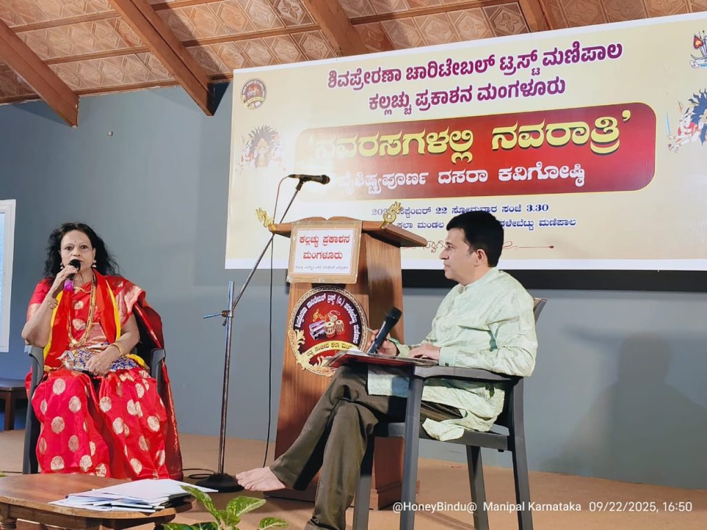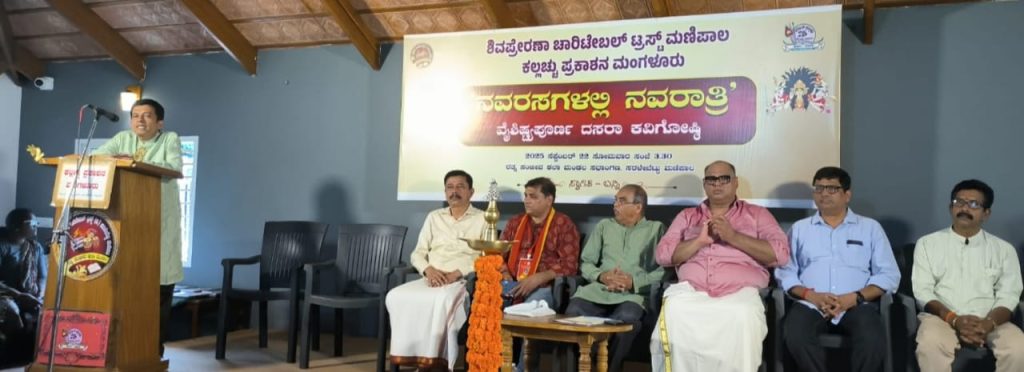 ಉಡುಪಿ : ಶಿವಪ್ರೇರಣ ಚಾರಿಟೇಬಲ್ ಟ್ರಸ್ಟ್ ಮಣಿಪಾಲ ಮತ್ತು ಕಲ್ಲಚ್ಚು ಪ್ರಕಾಶನ ಮಂಗಳೂರು ಇದರ ಜಂಟಿ ಆಶ್ರಯದಲ್ಲಿ ಮಣಿಪಾಲದ ರತ್ನ ಸಂಜೀವ ಕಲಾ ಮಂಡಲ ವೇದಿಕೆಯಲ್ಲಿ ದಿನಾಂಕ 22 ಸೆಪ್ಟೆಂಬರ್ 2025ರಂದು ನಡೆದ ನವರಸಗಳಲ್ಲಿ ನವರಾತ್ರಿ ಎಂಬ ಕವಿಗೋಷ್ಠಿ ನಡೆಯಿತು.