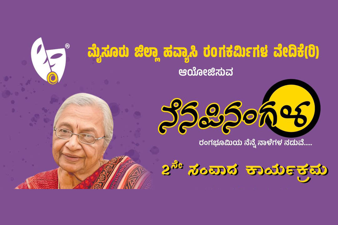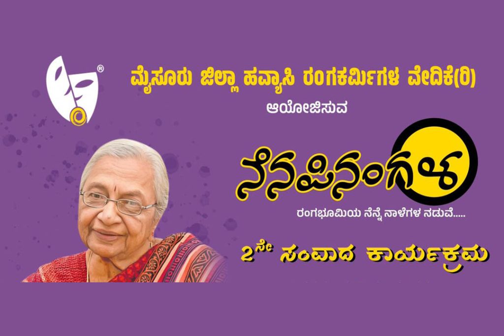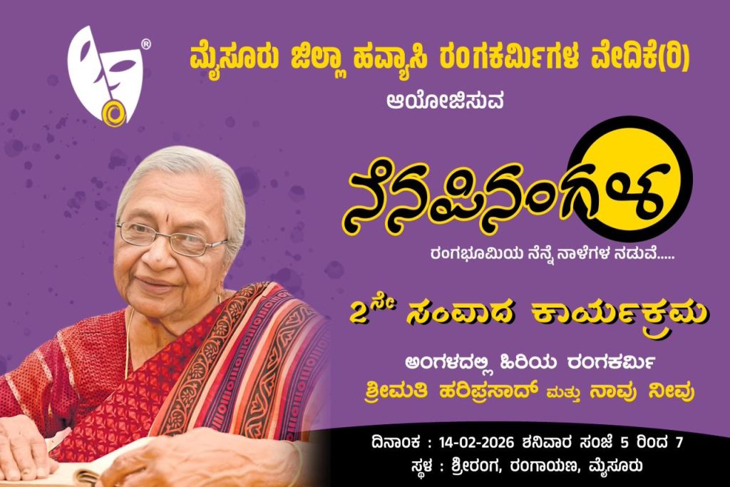 ಮೈಸೂರು : ಮೈಸೂರು ಜಿಲ್ಲಾ ಹವ್ಯಾಸಿ ರಂಗಕರ್ಮಿಗಳ ವೇದಿಕೆ (ರಿ.) ಆಯೋಜಿಸುವ ‘ನೆನಪಿನಂಗಳ’ ರಂಗಭೂಮಿಯ ನೆನ್ನೆ ನಾಳೆಗಳ ನಡುವೆ 2ನೇ ಸಂವಾದ ಕಾರ್ಯಕ್ರಮವನ್ನು ದಿನಾಂಕ 14 ಫೆಬ್ರವರಿ 2026ರಂದು ಸಂಜೆ 5-00 ಗಂಟೆಗೆ ಮೈಸೂರು ರಂಗಾಯಣದ ‘ಶ್ರೀರಂಗ’ದಲ್ಲಿ ಹಮ್ಮಿಕೊಳ್ಳಲಾಗಿದೆ. ಅಂಗಳದಲ್ಲಿ ಹಿರಿಯ ರಂಗಕರ್ಮಿ ಶ್ರೀಮತಿ ಹರಿಪ್ರಸಾದ್ ಇವರು ಭಾಗವಹಿಸಲಿದ್ದಾರೆ.