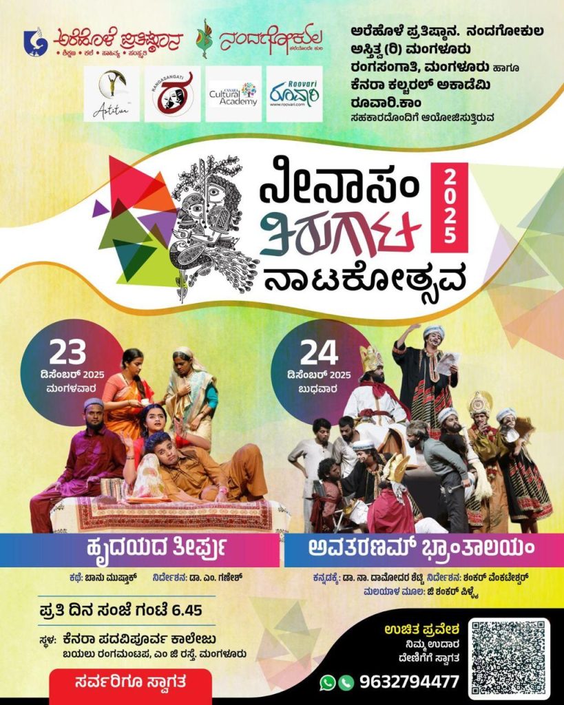 ಮಂಗಳೂರು : ಅರೆಹೊಳೆ ಪ್ರತಿಷ್ಠಾನ, ನಂದಗೋಕುಲ, ಅಸ್ತಿತ್ವ (ರಿ.) ಮಂಗಳೂರು, ರಂಗಸಂಗಾತಿ ಮಂಗಳೂರು, ಕೆನರಾ ಕಲ್ಚರ್ ಅಕಾಡೆಮಿ ಮತ್ತು ರೂವಾರಿ. ಕಾಂ ಇವರ ಸಹಕಾರದೊಂದಿಗೆ ಆಯೋಜಿಸುತ್ತಿರುವ ‘ನೀನಾಸಂ ತಿರುಗಾಟ ನಾಟಕೋತ್ಸವ 2025’ವು ದಿನಾಂಕ 23 ಮತ್ತು 24 ಡಿಸೆಂಬರ್ 2025ರಂದು ಪ್ರತಿದಿನ ಸಂಜೆ ಗಂಟೆ 6-45ಕ್ಕೆ ಮಂಗಳೂರಿನ ಕೆನರಾ ಪದವಿಪೂರ್ವ ಕಾಲೇಜಿನ ಬಯಲು ರಂಗಮಂಟಪದಲ್ಲಿ ನಡೆಯಲಿದೆ.