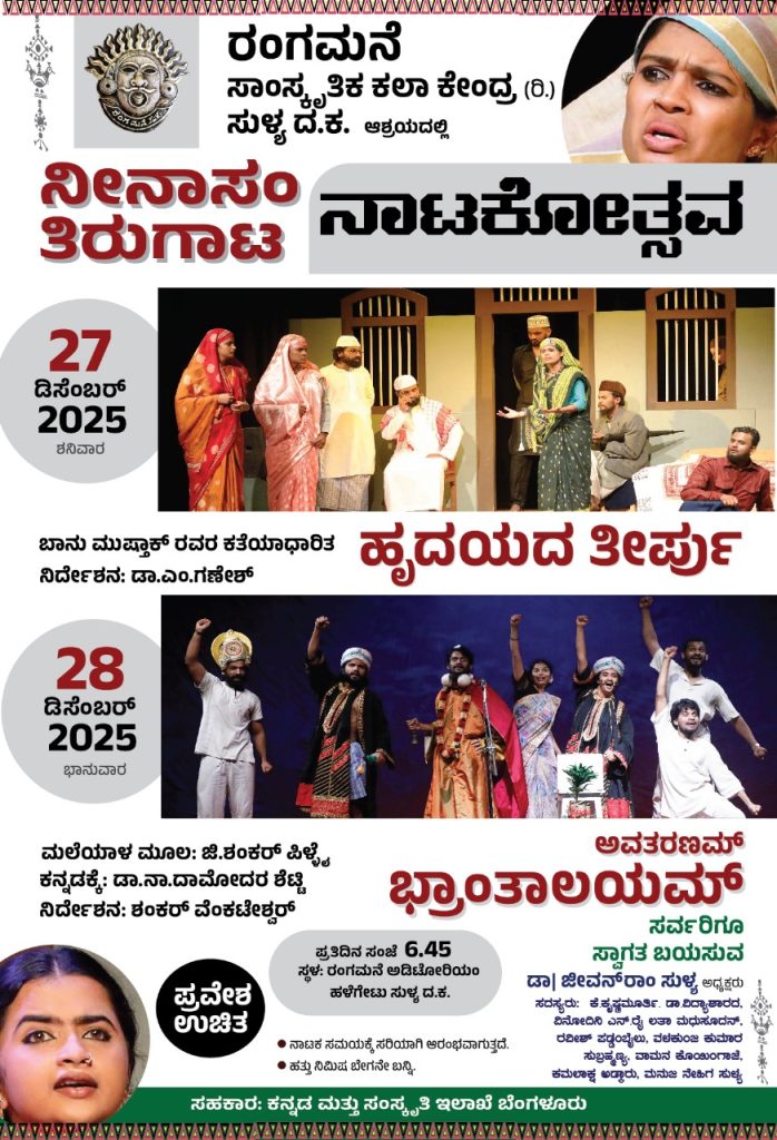 ಸುಳ್ಯ : ಸುಳ್ಯ ಹಳೆಗೇಟಿನಲ್ಲಿರುವ ರಂಗಮನೆ ಸಾಂಸ್ಕೃತಿಕ ಕಲಾ ಕೇಂದ್ರದ ಆಶ್ರಯದಲ್ಲಿ ಕನ್ನಡ ಮತ್ತು ಸಂಸ್ಕೃತಿ ಇಲಾಖೆಯ ಸಹಕಾರದೊಂದಿಗೆ ದಿನಾಂಕ 27 ಮತ್ತು 28 ಡಿಸೆಂಬರ್ 2025ರಂದು ರಂಗಮನೆ ಅಡಿಟೋರಿಯಂನಲ್ಲಿ ನೀನಾಸಂ ತಿರುಗಾಟದ ನಾಟಕಗಳ ಪ್ರದರ್ಶನವನ್ನು ಏರ್ಪಡಿಸಲಾಗಿದೆ.