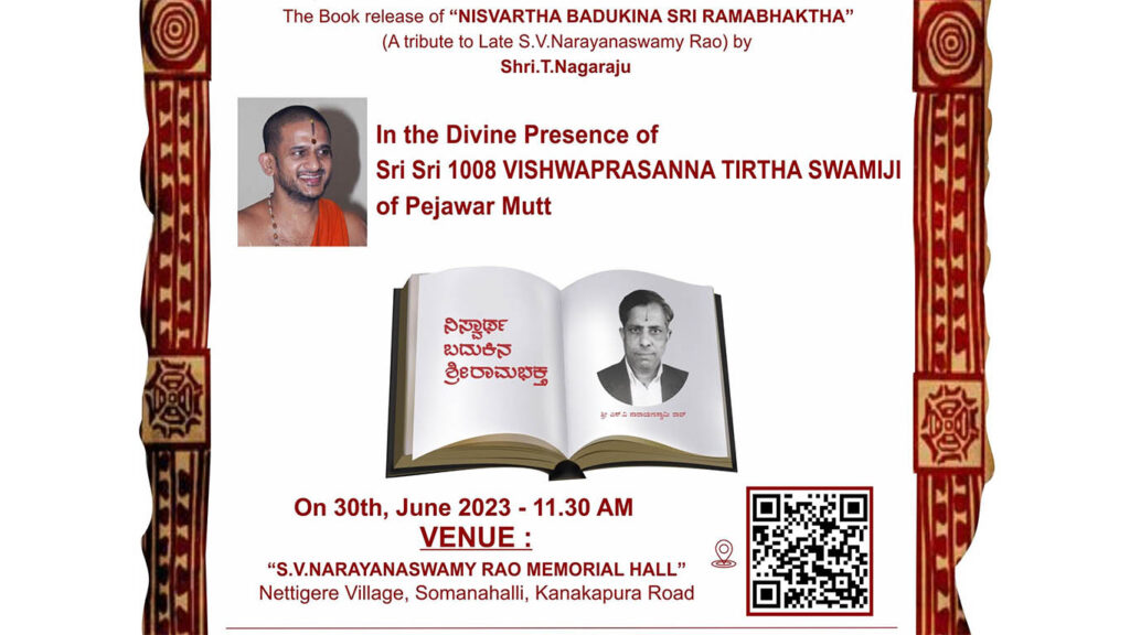 Home » ನೆಟ್ಟಿಗೆರೆ ಗ್ರಾಮದಲ್ಲಿ ‘ಎಸ್.ವಿ. ನಾರಾಯಣಸ್ವಾಮಿ ರಾವ್ ಮೆಮೊರಿಯಲ್ ಹಾಲ್’ ಮತ್ತು ‘ನಿಸ್ವಾರ್ಥ ಬದುಕಿನ ಶ್ರೀ ರಾಮಭಕ್ತ’ ಕೃತಿಯ ಲೋಕಾರ್ಪಣೆ | ಜೂನ್ 30ರಂದು