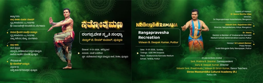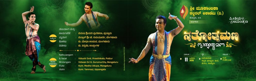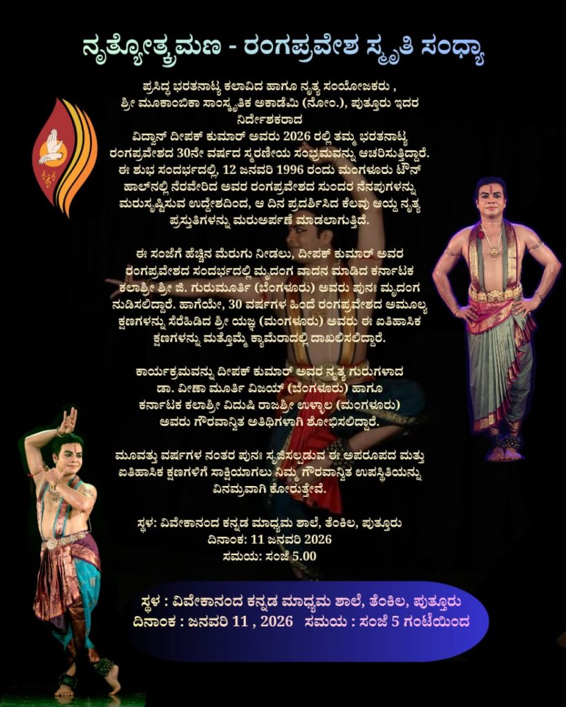 ಪುತ್ತೂರು : ಶ್ರೀ ಮೂಕಾಂಬಿಕಾ ಕಲ್ಚರಲ್ ಅಕಾಡೆಮಿ (ರಿ.) ಪುತ್ತೂರು ಅರ್ಪಿಸುವ ‘ನೃತ್ಯೋತ್ಕ್ರಮಣ’ ರಂಗಪ್ರವೇಶ ಸ್ಮೃತಿ ಸಂಧ್ಯಾ ಭರತನಾಟ್ಯ ಕಾರ್ಯಕ್ರಮವನ್ನು ದಿನಾಂಕ 11 ಜನವರಿ 2026ರಂದು ಸಂಜೆ ಗಂಟೆ 5-00ಕ್ಕೆ ಪುತ್ತೂರಿನ ತೆಂಕಿಲ ವಿವೇಕಾನಂದ ಕನ್ನಡ ಮಾಧ್ಯಮ ಶಾಲೆಯಲ್ಲಿ ಹಮ್ಮಿಕೊಳ್ಳಲಾಗಿದೆ.