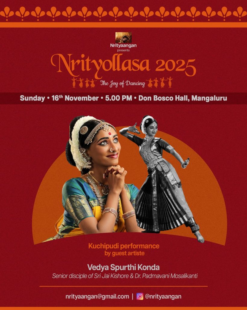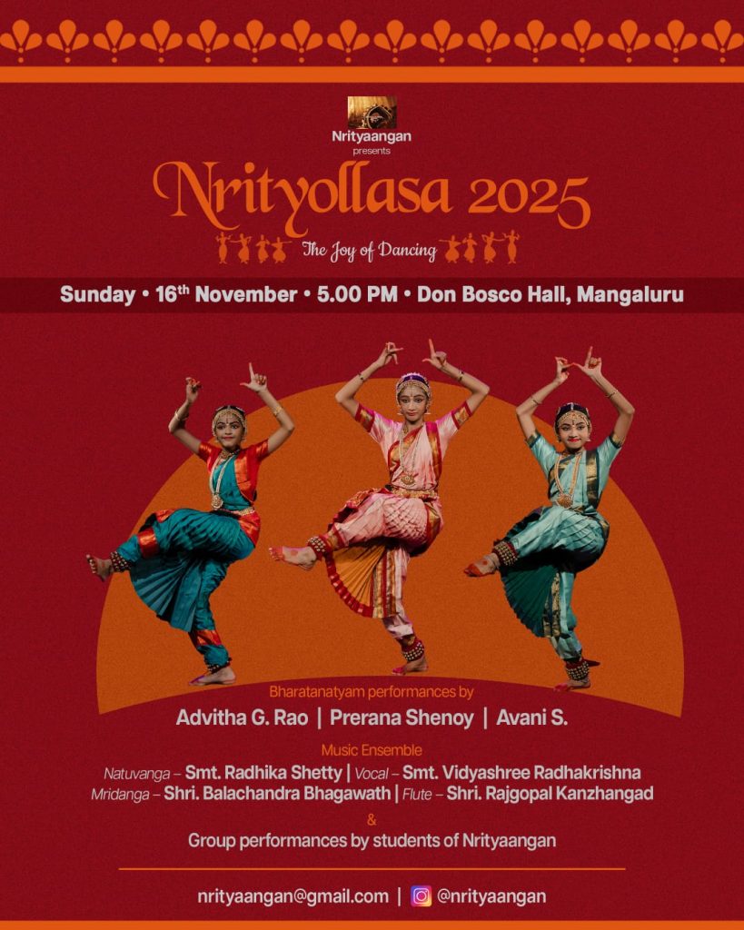 ಮಂಗಳೂರು : ಬಿಜೈಯಲ್ಲಿರುವ ನೃತ್ಯಾಂಗನ್ ಸಂಸ್ಥೆಯ ವತಿಯಿಂದ ‘ನೃತ್ಯೋಲ್ಲಾಸ 2025’ ಕಾರ್ಯಕ್ರಮವನ್ನು ದಿನಾಂಕ 16 ನವೆಂಬರ್ 2025ರಂದು ಸಾಯಂಕಾಲ 5-00 ಗಂಟೆಗೆ ಮಂಗಳೂರಿನ ಡಾನ್ ಬೋಸ್ಕೋ ಹಾಲ್ ನಲ್ಲಿ ಹಮ್ಮಿಕೊಳ್ಳಲಾಗಿದೆ.