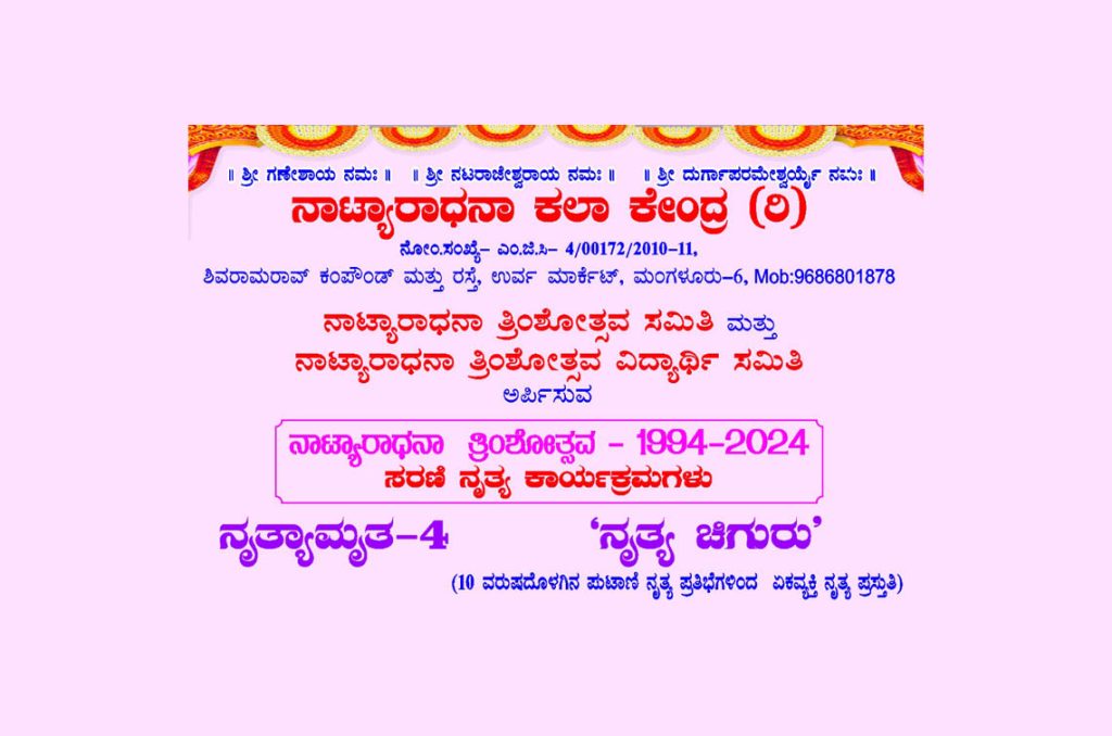 ಮಂಗಳೂರು : ನಾಟ್ಯಾರಾಧನಾ ಕಲಾ ಕೇಂದ್ರ (ರಿ.), ನಾಟ್ಯಾರಾಧನಾ ತ್ರಿಂಶೋತ್ಸವ ಸಮಿತಿ ಮತ್ತು ನಾಟ್ಯಾರಾಧನಾ ತ್ರಿಂಶೋತ್ಸವ ವಿದ್ಯಾರ್ಥಿ ಸಮಿತಿ ಅರ್ಪಿಸುವ ನಾಟ್ಯಾರಾಧನಾ ತ್ರಿಂಶೋತ್ಸವದ ನೃತ್ಯಾಮೃತ -4ರಲ್ಲಿ ‘ನೃತ್ಯ ಚಿಗುರು’ ಸರಣಿ ನೃತ್ಯ ಕಾರ್ಯಕ್ರಮವು ದಿನಾಂಕ 30-05-2024ರಂದು ಸಂಜೆ ಗಂಟೆ 5-30ರಿಂದ ಮಂಗಳೂರಿನ ಕೆನರಾ ಸಿ.ಬಿ.ಎಸ್.ಸಿ. ಶಾಲೆಯ ಭುವನೇಂದ್ರ ಸಭಾಸದನದಲ್ಲಿ ನಡೆಯಲಿದೆ.