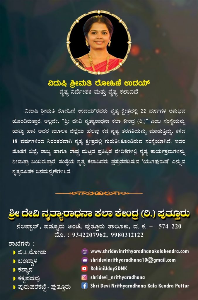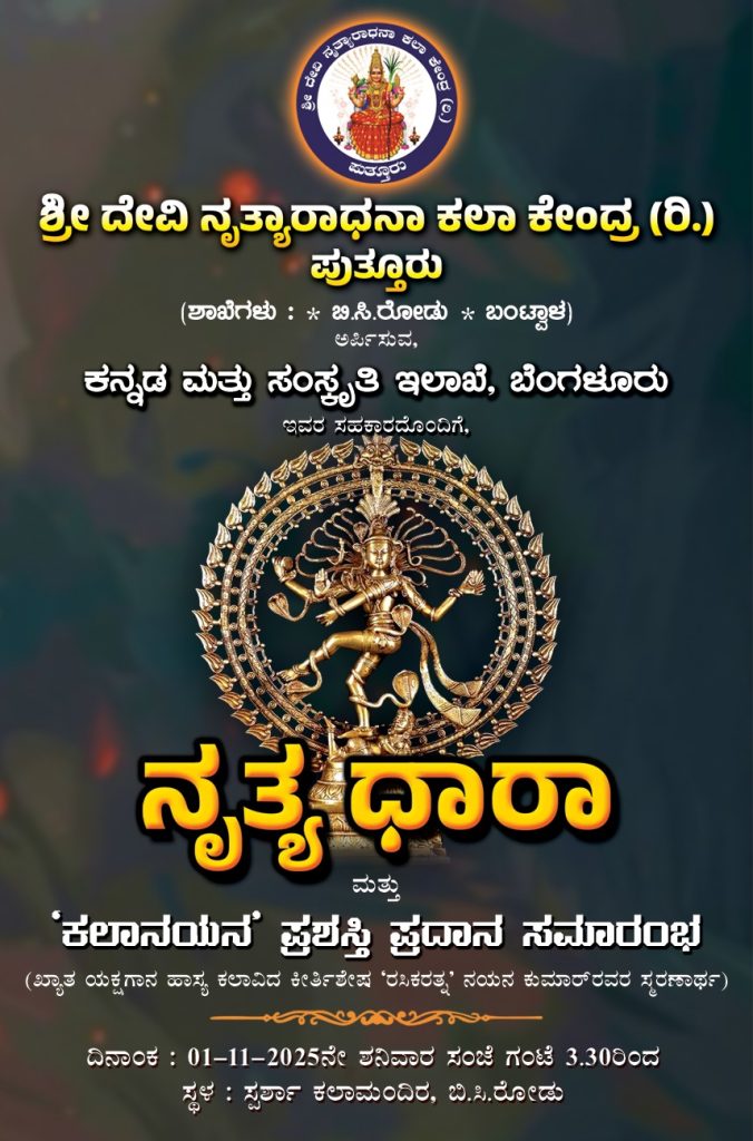 ಬಿ.ಸಿ. ರೋಡ್ : ಶ್ರೀ ದೇವಿ ನೃತ್ಯಾರಾಧನಾ ಕಲಾ ಕೇಂದ್ರ (ರಿ.) ಪುತ್ತೂರು ಇವರು ಕನ್ನಡ ಮತ್ತು ಸಂಸ್ಕೃತಿ ಇಲಾಖೆ ಬೆಂಗಳೂರು ಇವರ ಸಹಕಾರದೊಂದಿಗೆ ಪ್ರಸ್ತುತ ಪಡಿಸುವ ‘ನೃತ್ಯ ಧಾರಾ’ ಮತ್ತು ‘ಕಲಾನಯನ’ ಪ್ರಶಸ್ತಿ ಪ್ರದಾನ ಸಮಾರಂಭವನ್ನು ದಿನಾಂಕ 01 ನವೆಂಬರ್ 2025 ರಂದು ಸಂಜೆ 3-30 ಗಂಟೆಗೆ ಬಂಟ್ವಾಳ ಬಿ.ಸಿ. ರೋಡಿನ ಸ್ಪರ್ಶಾ ಕಲಾಮಂದಿರದಲ್ಲಿ ಹಮ್ಮಿಕೊಳ್ಳಲಾಗಿದೆ.