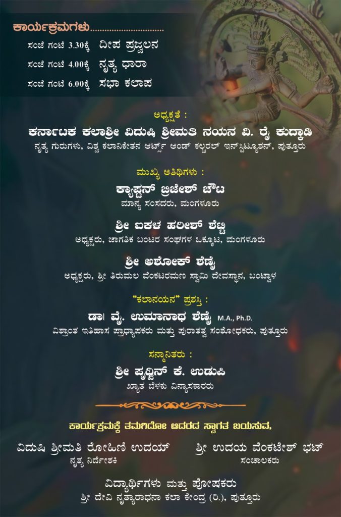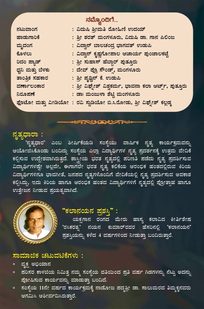 ಈ ಸಮಾರಂಭದ ಅಧ್ಯಕ್ಷತೆಯನ್ನು ನೃತ್ಯ ಗುರುಗಳಾದ ವಿದುಷಿ ನಯನ ವಿ. ರೈ ಇವರು ವಹಿಸಲಿದ್ದು, ಪುತ್ತೂರಿನ ವಿಶ್ರಾಂತ ಇತಿಹಾಸ ಪ್ರಾಧ್ಯಾಪಕರು ಮತ್ತು ಪುರಾತತ್ವ ಸಂಶೋಧಕರಾದ ಡಾ. ವೈ. ಉಮಾನಾಥ ಶೆಣೈ ಇವರಿಗೆ ‘ಕಲಾನಯನ’ ಪ್ರಶಸ್ತಿ ಪ್ರದಾನ ಮತ್ತು ಖ್ಯಾತ ಬೆಳಕು ವಿನ್ಯಾಸಕಾರರಾದ ಪೃಥ್ವಿನ್ ಕೆ. ಉಡುಪ ಇವರನ್ನು ಸನ್ಮಾನಿಲಾಗುವುದು. ಸಂಸ್ಥೆಯ ವಿದ್ಯಾರ್ಥಿಗಳಿಂದ ಪ್ರಸ್ತುತಗೊಳ್ಳುವ ‘ನೃತ್ಯ ಧಾರಾ’ ಭರತನಾಟ್ಯಕ್ಕೆ ನಟುವಾಂಗದಲ್ಲಿ ವಿದುಷಿ ರೋಹಿಣಿ ಉದಯ್, ಹಾಡುಗಾರಿಕೆಯಲ್ಲಿ ಶರತ್ ಮಂಗಳೂರು ಮತ್ತು ವಿದುಷಿ ಗಾನ ಪಿಲಿಂಜ, ಮೃದಂಗದಲ್ಲಿ ವಿದ್ವಾನ್ ಬಾಲಚಂದ್ರ ಭಾಗವತ್ ಉಡುಪಿ, ಕೊಳಲಿನಲ್ಲಿ ವಿದ್ವಾನ್ ಕೃಷ್ಣ ಗೋಪಾಲ ಆಚಾರ್ಯ ಪುಂಜಾಲಕಟ್ಟೆ, ರಿದಂ ಪ್ಯಾಡಿನಲ್ಲಿ ಸುಹಾಸ್ ಹೆಬ್ಬಾರ್ ಪುತ್ತೂರು ಇವರುಗಳು ಸಹಕರಿಸಲಿದ್ದಾರೆ.
