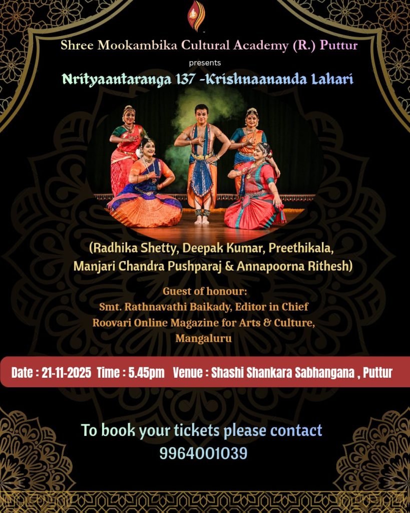 ಪುತ್ತೂರು : ಶ್ರೀ ಮೂಕಾಂಬಿಕಾ ಕಲ್ಚರಲ್ ಅಕಾಡೆಮಿ (ರಿ.) ಪುತ್ತೂರು ಪ್ರಸ್ತುತ ಪಡಿಸುವ ‘ನೃತ್ಯಾಂತರಂಗ 137’ ಕೃಷ್ಣಾನಂದ ಲಹರಿ ಭರತನಾಟ್ಯ ಕಾರ್ಯಕ್ರಮವನ್ನು ದಿನಾಂಕ 21 ನವೆಂಬರ್ 2025ರಂದು ಸಂಜೆ ಗಂಟೆ 5-45ಕ್ಕೆ ಪುತ್ತೂರಿನ ದರ್ಬೆಯ ಶಶಿಶಂಕರ ಸಭಾಂಗಣದಲ್ಲಿ ಹಮ್ಮಿಕೊಳ್ಳಲಾಗಿದೆ.