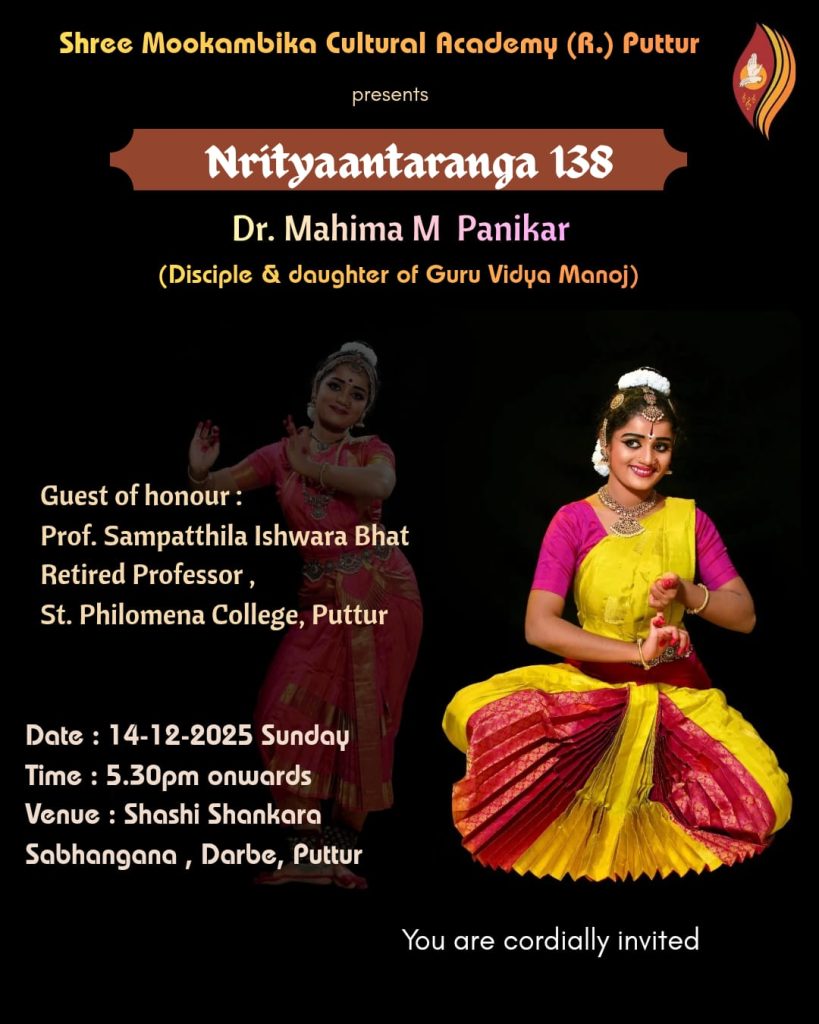ಪುತ್ತೂರು : ಶ್ರೀ ಮೂಕಾಂಬಿಕಾ ಕಲ್ಚರಲ್ ಅಕಾಡೆಮಿ (ರಿ.) ಪುತ್ತೂರು ಪ್ರಸ್ತುತ ಪಡಿಸುವ ‘ನೃತ್ಯಾಂತರಂಗ 138’ ಭರತನಾಟ್ಯ ಕಾರ್ಯಕ್ರಮವನ್ನು ದಿನಾಂಕ 14 ಡಿಸೆಂಬರ್ 2025ರಂದು ಸಂಜೆ ಗಂಟೆ 5-30ಕ್ಕೆ ಪುತ್ತೂರಿನ ದರ್ಬೆಯ ಶಶಿಶಂಕರ ಸಭಾಂಗಣದಲ್ಲಿ ಹಮ್ಮಿಕೊಳ್ಳಲಾಗಿದೆ.