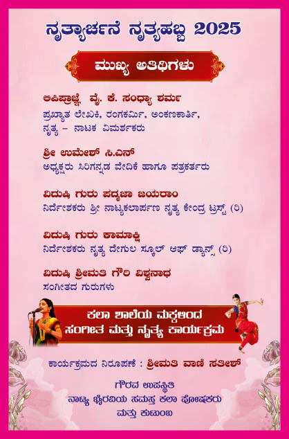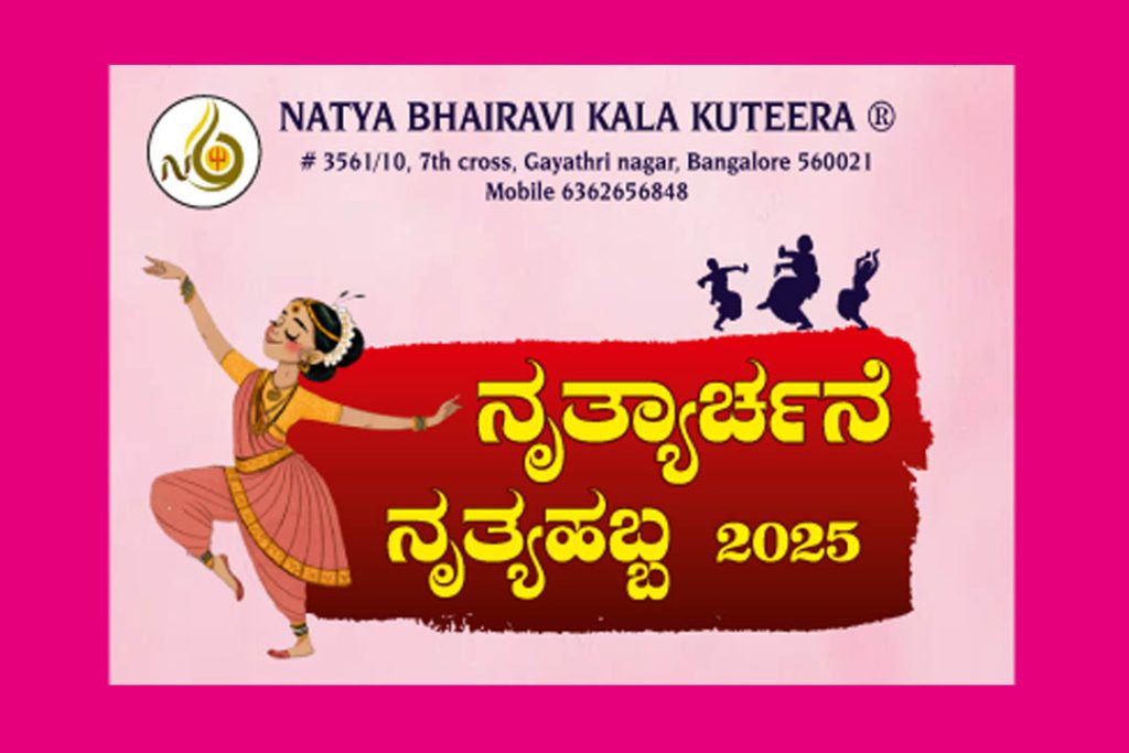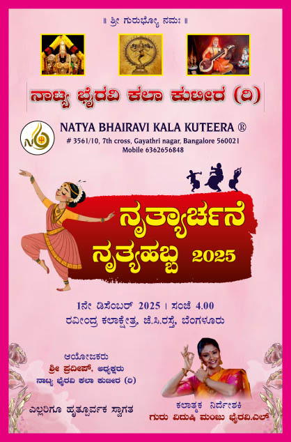 ಪ್ರಸ್ತುತ ‘ನಾಟ್ಯ ಭೈರವಿ ಕಲಾ ಕುಟೀರ’ ದಿನಾಂಕ 01 ಡಿಸೆಂಬರ್ 2025ರ ಸೋಮವಾರ ಸಂಜೆ 5-00 ಗಂಟೆಗೆ ಬೆಂಗಳೂರಿನ ರವೀಂದ್ರ ಕಲಾಕ್ಷೇತ್ರದಲ್ಲಿ ‘ನೃತ್ಯಾರ್ಚನೆ ನೃತ್ಯಹಬ್ಬ-2025’ ವೈವಿಧ್ಯಪೂರ್ಣ ಸಂಗೀತ-ನೃತ್ಯಾವಳಿಗಳನ್ನು ಹಮ್ಮಿಕೊಂಡಿದೆ. ಕಾರ್ಯಕ್ರಮದಲ್ಲಿ ಲೇಖಕಿ- ನೃತ್ಯ ವಿಮರ್ಶಕಿ ಶ್ರೀಮತಿ ವೈ.ಕೆ. ಸಂಧ್ಯಾ ಶರ್ಮ, ನೃತ್ಯಗುರು ಪದ್ಮಜಾ ಜಯರಾಂ ಮತ್ತು ಕಾಮಾಕ್ಷಿ ಮುಂತಾದವರು ಅತಿಥಿಗಳಾಗಿ ಭಾಗವಹಿಸಲಿದ್ದಾರೆ.