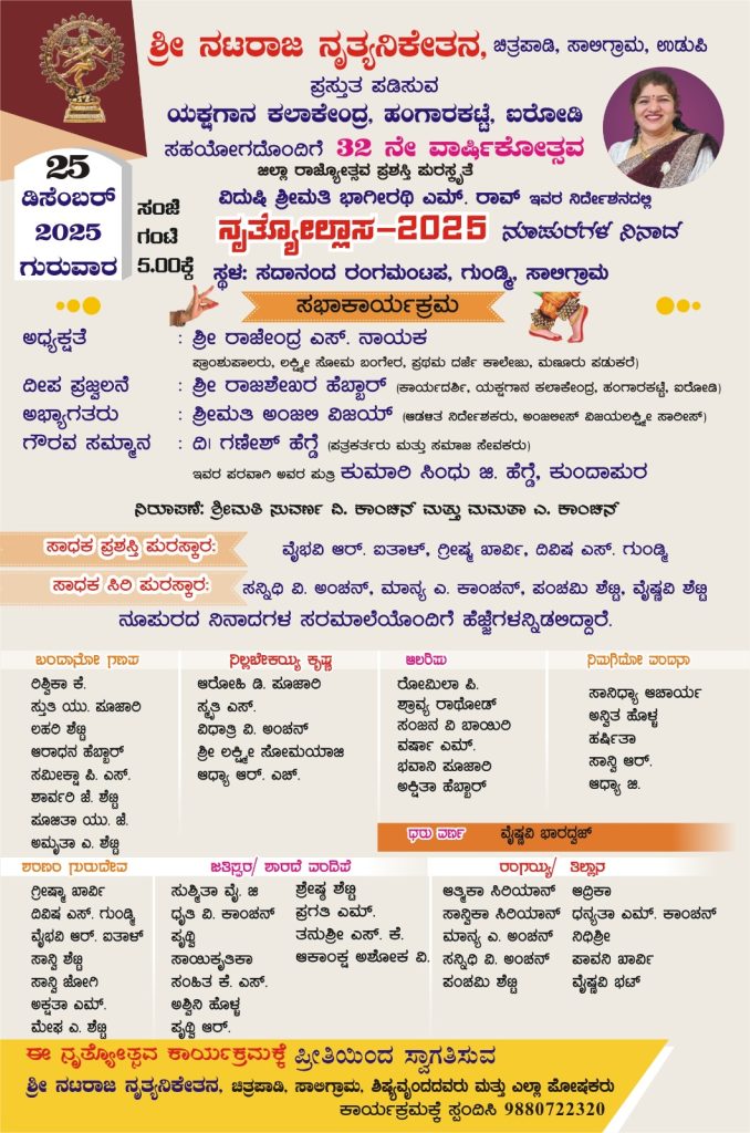 ಉಡುಪಿ : ಶ್ರೀ ನಟರಾಜ ನೃತ್ಯನಿಕೇತನ ಚಿತ್ರಪಾಡಿ ಸಾಲಿಗ್ರಾಮ ಉಡುಪಿ ಪ್ರಸ್ತುತ ಪಡಿಸುವ ಯಕ್ಷಗಾನ ಕಲಾಕೇಂದ್ರ ಹಂಗಾರಕಟ್ಟೆ ಐರೋಡಿ ಸಹಯೋಗದೊಂದಿಗೆ 32ನೇ ವಾರ್ಷಿಕೋತ್ಸವ ‘ನೃತ್ಯೋಲ್ಲಾಸ 2025’ ಕಾರ್ಯಕ್ರಮವನ್ನು ದಿನಾಂಕ 25 ಡಿಸೆಂಬರ್ 2025ರಂದು ಸಂಜೆ 5-00 ಗಂಟೆಗೆ ಸಾಲಿಗ್ರಾಮ ಗುಂಡ್ಮಿಯ ಸದಾನಂದ ರಂಗಮಂಟಪದಲ್ಲಿ ಹಮ್ಮಿಕೊಳ್ಳಲಾಗಿದೆ.