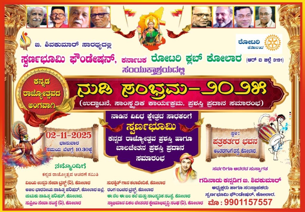 ಕೋಲಾರ : ಬಿ. ಶಿವಕುಮಾರ್ ಸಾರಥ್ಯದ ಸ್ವರ್ಣಭೂಮಿ ಫೌಂಡೇಷನ್ ಕರ್ನಾಟಕ ಹಾಗೂ ರೋಟರಿ ಕ್ಲಬ್ ಕೋಲಾರ ಇವುಗಳ ಸಂಯುಕ್ತಾಶ್ರಯದಲ್ಲಿ ಕನ್ನಡ ರಾಜ್ಯೋತ್ಸವದ ಅಂಗವಾಗಿ ‘ನುಡಿ ಸಂಭ್ರಮ -2025’ವನ್ನು ದಿನಾಂಕ 02 ನವೆಂಬರ್ 2025ರಂದು ಬೆಳಗ್ಗೆ 10-30 ಗಂಟೆಗೆ ಕೋಲಾರದ ಪತ್ರಕರ್ತರ ಭವನದಲ್ಲಿ ಹಮ್ಮಿಕೊಳ್ಳಲಾಗಿದೆ.