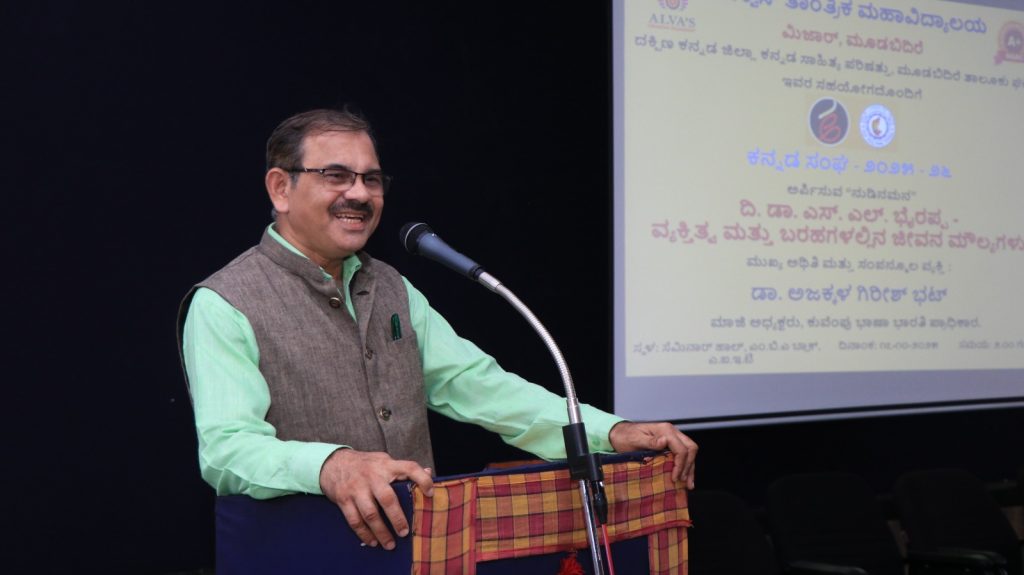 ಈ ಕಾರ್ಯಕ್ರಮದಲ್ಲಿ ಡಾ. ಎಸ್.ಎಲ್. ಭೈರಪ್ಪರವರ – ವ್ಯಕ್ತಿತ್ವ ಮತ್ತು ಬರಹಗಳಲ್ಲಿನ ಜೀವನ ಮೌಲ್ಯಗಳ ಕುರಿತು ಮಾತನಾಡಿದ ಕುವೆಂಪು ಭಾಷಾ ಭಾರತಿ ಪ್ರಾಧಿಕಾರದ ಮಾಜಿ ಅಧ್ಯಕ್ಷ ಡಾ. ಅಜಕ್ಕಳ ಗಿರೀಶ್ ಭಟ್ ಇವರು “ಕನ್ನಡ ಸಾರಸ್ವತ ಲೋಕದಲ್ಲಿ ಅತ್ಯಂತ ಹೆಚ್ಚು ರಾಯಧನ (ರಾಯಲ್ಟಿ) ಪಡೆಯುತ್ತಿದ್ದವರು ಎಸ್.ಎಲ್. ಭೈರಪ್ಪನವರು. ಸಾಹಿತ್ಯದಿಂದ ಪಡೆದ ಹಣವನ್ನು ಸಂಪೂರ್ಣವಾಗಿ ಸಮಾಜಕ್ಕೆ ಹಿಂದಿರುಗಿಸಿದ ಕೀರ್ತಿಯು ಭೈರಪ್ಪರವರಿಗೆ ಸಲ್ಲುತ್ತದೆ. ಎಸ್.ಎಲ್. ಭೈರಪ್ಪನವರು ಬಾಲ್ಯದಿಂದಲೇ ಕಷ್ಟದ ಬದುಕನ್ನು ಬಾಳಿದವರು. ಇದರಿಂದಾಗಿ ಅವರ ಸಾಹಿತ್ಯದಲ್ಲಿ ಅನುಭವ ಶ್ರೀಮಂತಿಕೆ ಇದೆ. ಲೇಖಕನಿಗೆ ಅನುಭವ ಮುಖ್ಯ. ಅನುಭವ ಮತ್ತು ಕಲ್ಪನೆಯನ್ನು ಸಾಹಿತ್ಯದಲ್ಲಿ ಬೆರೆಸಿದಾಗ ಮಾತ್ರ ಸಾಹಿತ್ಯ ಓದುಗನಿಗೆ ಕಾಣುತ್ತದೆ. ಓದುಗನು ಪಾತ್ರವನ್ನು ತನ್ನಲ್ಲಿ ಕಂಡಾಗ ಮಾತ್ರ ಅದು ಲೇಖಕ ಯಶಸ್ವಿಯಾಗುತ್ತಾನೆ ಎಂದರು. ಭೈರಪ್ಪನವರು ಎಂದೂ ಪ್ರಚಾರವನ್ನು ನಿರೀಕ್ಷಿಸದ ವ್ಯಕ್ತಿ. ಅವರು ಸಮಾಜದಿಂದ ಪಡೆದುಕೊಂದದ್ದನ್ನು ಸಮಾಜಕ್ಕೆ ಹಿಂತಿರುಗಿಸಬೇಕು ಎಂಬ ದೃಢ ನಿಲುವನ್ನು ಹೊಂದಿದ್ದರು. ತಾನು ಸತ್ತಾಗ ತನ್ನ ಖಾತೆಯಲ್ಲಿ ಯಾವುದೇ ಹಣ ಉಳಿದಿರಬಾರದು. ಸಮಾಜ ತನಗೆ ನೀಡಿದ ಕೊಡುಗೆಯನ್ನು ಸಮಾಜಕ್ಕೆ ಸೇರಬೇಕು ಎನ್ನುತ್ತಿದ್ದರು. ಭೈರಪ್ಪ ಒಬ್ಬ ಸಾಹಿತಿ, ತತ್ವಜ್ಞಾನಿ, ಪಂಡಿತರಾಗಿ, ಮೌಲ್ಯಪ್ರಜ್ಞೆ, ಕಾಳಜಿ, ಸ್ನೇಹ, ವಾತ್ಸಲ್ಯ ಮುಂತಾದ ಮೌಲ್ಯಗಳಿಂದ ಶ್ರೇಷ್ಠತ್ವವನ್ನು ಹೊಂದಿದ್ದರು. ಅವರ ತಂತು, ಪರ್ವ, ವಂಶವೃಕ್ಷ, ತಬ್ಬಲಿ ನೀನಾದೆ ಕಾದಂಬರಿಗಳಲ್ಲಿ ದೇಶ ಪ್ರೇಮ, ಪರಿಸರ ಪ್ರೇಮ, ಪ್ರಾಣಿ ದಯೆ, ಸ್ನೇಹ, ಕಾಳಜಿ, ಜೀವನಾನುಭವ ಅಡಕವಾಗಿದ್ದವು” ಎಂದು ತಿಳಿಸಿದರು.