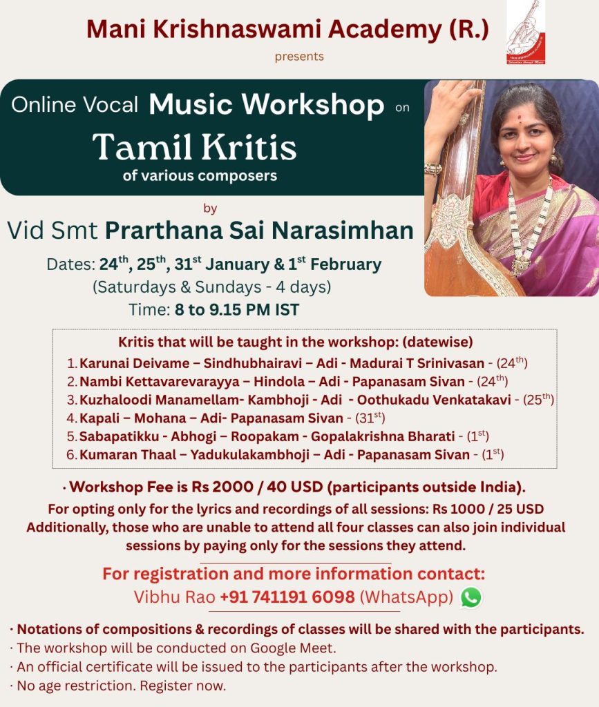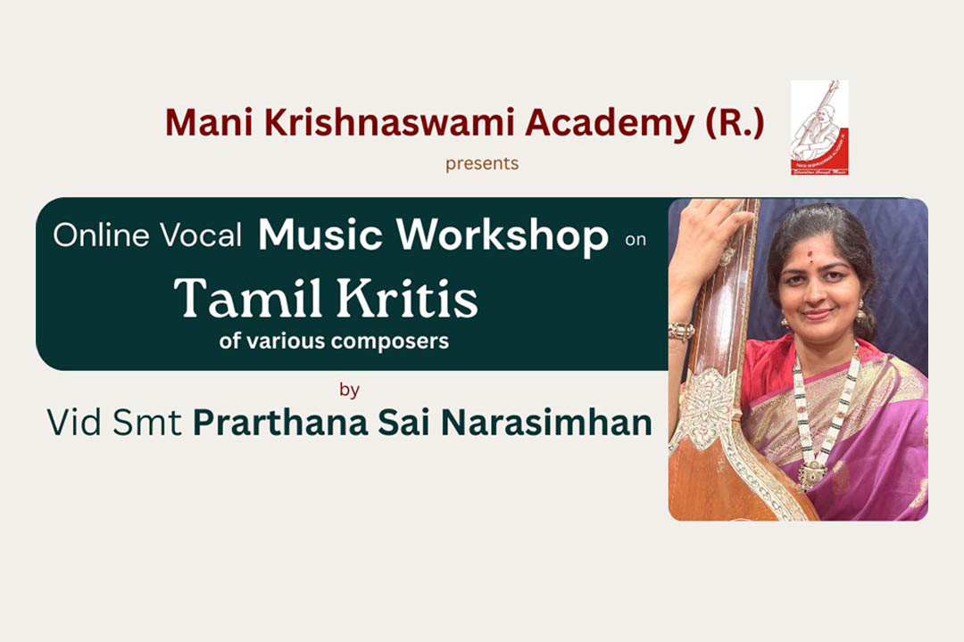 ಮಂಗಳೂರು : ಮಣಿ ಕೃಷ್ಣಸ್ವಾಮಿ ಅಕಾಡೆಮಿ ವತಿಯಿಂದ ಪ್ರಸ್ತುತ ಪಡಿಸುವ ಗಾಯನ ಸಂಗೀತ ಕಾರ್ಯಾಗಾರವು ದಿನಾಂಕ 24, 25, 31 ಜನವರಿ ಮತ್ತು 01 ಫೆಬ್ರುವರಿ 2026ರಂದು (ಶನಿವಾರ ಮತ್ತು ಭಾನುವಾರ) ಸಂಜೆ 8-00 ಗಂಟೆಯಿಂದ 9-15ರವೆರೆಗೆ ಆನ್ ಲೈನ್ ನಲ್ಲಿ ನಡೆಯಲಿದೆ. ಸಂಗೀತ ಕಲಾ ಆಚಾರ್ಯ ವಿದುಷಿ ಪ್ರಾರ್ಥನಾ ಸಾಯಿ ನರಸಿಂಹನ್ ಇವರು ಕಾರ್ಯಾಗಾರವನ್ನು ನಡೆಸಿಕೊಡಲಿದ್ದು, ವಿವಿಧ ಸಂಯೋಜಕರ ತಮಿಳು ಕೃತಿಗಳನ್ನು ಕಲಿಸಲಾಗುವುದು. ನೋಂದಾವಣೆ ಮತ್ತು ಹೆಚ್ಚಿನ ಮಾಹಿತಿಗಾಗಿ 74119 16098 ಸಂಖ್ಯೆಯನ್ನು ಸಂಪರ್ಕಿಸಿರಿ.