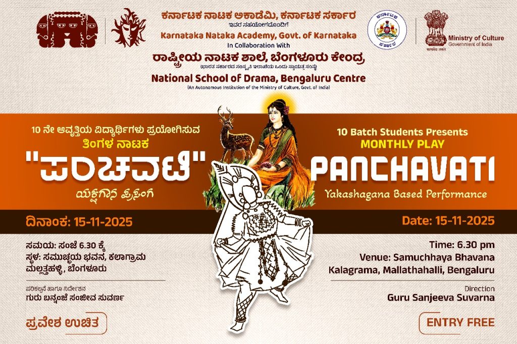 ಬೆಂಗಳೂರು : ಕರ್ನಾಟಕ ನಾಟಕ ಅಕಾಡೆಮಿ ಕರ್ನಾಟಕ ಸರ್ಕಾರ ಮತ್ತು ರಾಷ್ಟ್ರೀಯ ನಾಟಕ ಶಾಲೆ ಬೆಂಗಳೂರು ಕೇಂದ್ರ ಇವರ ಸಹಯೋಗದೊಂದಿಗೆ ‘ತಿಂಗಳ ನಾಟಕ ಸಂಭ್ರಮ’ದ ಪ್ರಯುಕ್ತ ನಾಟಕ ಪ್ರದರ್ಶನವನ್ನು ದಿನಾಂಕ 15 ನವೆಂಬರ್ 2025ರಂದು ಸಂಜೆ 6-30 ಗಂಟೆಗೆ ಬೆಂಗಳೂರಿನ ಮಲ್ಲತ್ತಹಳ್ಳಿಯ ಕಲಾಗ್ರಾಮದ ಸಮುಚ್ಚಯ ಭವನದಲ್ಲಿ ಹಮ್ಮಿಕೊಳ್ಳಲಾಗಿದೆ. 10ನೇ ಆವೃತ್ತಿಯ ವಿದ್ಯಾರ್ಥಿಗಳು ಪ್ರಯೋಗಿಸುವ ತಿಂಗಳ ನಾಟಕ ‘ಪಂಚವಟಿ’ ಯಕ್ಷಗಾನ ಪ್ರಸಂಗ ಗುರು ಬನ್ನಂಜೆ ಸಂಜೀವ ಸುವರ್ಣ ಇವರ ಪರಿಕಲ್ಪನೆ ಮತ್ತು ನಿರ್ದೇಶನದಲ್ಲಿ ಪ್ರದರ್ಶನಗೊಳ್ಳಲಿದೆ.