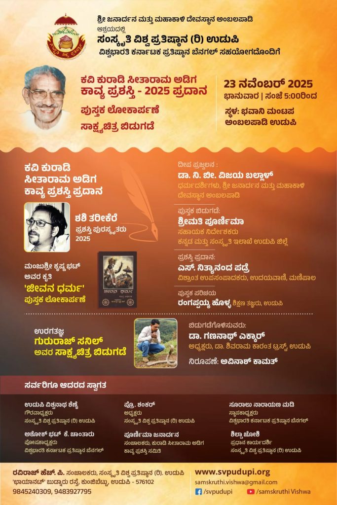 ಉಡುಪಿ : ಶ್ರೀ ಜನಾರ್ದನ ಮತ್ತು ಮಹಾಕಾಳಿ ದೇವಸ್ಥಾನ ಅಂಬಲಪಾಡಿ ಆಶ್ರಯದಲ್ಲಿ ಸಂಸ್ಕೃತಿ ವಿಶ್ವ ಪ್ರತಿಷ್ಠಾನ (ರಿ.) ಉಡುಪಿ ಮತ್ತು ವಿಶ್ವಭಾರತಿ ಕರ್ನಾಟಕ ಪ್ರತಿಷ್ಠಾನ ಬೆನಗಲ್ ಸಹಯೋಗದೊಂದಿಗೆ ಕವಿ ಕುರಾಡಿ ಸೀತಾರಾಮ ಅಡಿಗ ‘ಕಾವ್ಯ ಪ್ರಶಸ್ತಿ -2025’ ಪ್ರದಾನ ಸಮಾರಂಭವನ್ನು ದಿನಾಂಕ 23 ನವೆಂಬರ್ 2025ರಂದು ಸಂಜೆ 5-00 ಗಂಟೆಗೆ ಉಡುಪಿಯ ಅಂಬಲಪಾಡಿ ಭವಾನಿ ಮಂಟಪದಲ್ಲಿ ಆಯೋಜಿಸಲಾಗಿದೆ. ಇದೇ ಸಂದರ್ಭದಲ್ಲಿ ಪುಸ್ತಕ ಲೋಕಾರ್ಪಣೆ ಮತ್ತು ಸಾಕ್ಷ್ಯಚಿತ್ರ ಬಿಡುಗಡೆ ನಡೆಯಲಿದೆ.