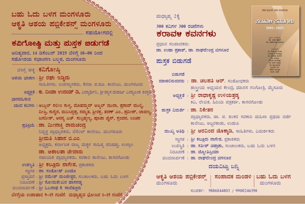 ಮಂಗಳೂರು : ಬಹು ಓದು ಬಳಗ ಮಂಗಳೂರು ಮತ್ತು ಆಕೃತಿ ಆಶಯ ಪಬ್ಲಿಕೇಶನ್ಸ್ ಮಂಗಳೂರು ಇವರ ಸಹಯೋಗದಲ್ಲಿ ಕವಿಗೋಷ್ಠಿ ಮತ್ತು ಪುಸ್ತಕ ಬಿಡುಗಡೆ ಸಮಾರಂಭವು ದಿನಾಂಕ 14 ಡಿಸೆಂಬರ್ 2025ರಂದು ಬೆಳಿಗ್ಗೆ 10-00 ಗಂಟೆಗೆ ಮಂಗಳೂರಿನ ಬಲ್ಮಠ ಸಹೋದಯ ಸಭಾಂಗಣದಲ್ಲಿ ನಡೆಯಲಿದೆ.