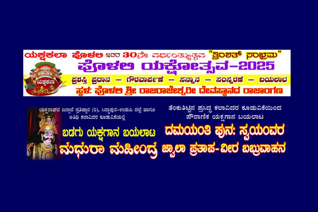 ಬಂಟ್ವಾಳ : ಯಕ್ಷಕಲಾ ಪೊಳಲಿ ಇದರ 30ನೇ ವರ್ಧಂತ್ಯುತ್ಸವ ತ್ರಿಂಶತಿ ಸಂಭ್ರಮದ ಪ್ರಯುಕ್ತ ‘ಪೊಳಲಿ ಯಕ್ಷೋತ್ಸವ- 2025’ ಪ್ರಶಸ್ತಿ ಪ್ರಧಾನ, ಗೌರವಾರ್ಪಣೆ, ಸನ್ಮಾನ, ಸಂಸ್ಮರಣೆ, ಬಯಲಾಟ ಮತ್ತು ಸಭಾ ಪರ್ವ ಕಾರ್ಯಕ್ರಮವನ್ನು ದಿನಾಂಕ 27 ಸೆಪ್ಟೆಂಬರ್ 2025ರಂದು ಸಂಜೆ 5-00 ಗಂಟೆಗೆ ಶ್ರೀ ಕ್ಷೇತ್ರ ಪೊಳಲಿ ಶ್ರೀ ರಾಜರಾಜೇಶ್ವರೀ ದೇವಸ್ಥಾನದ ರಾಜಾಂಗಣದಲ್ಲಿ ಆಯೋಜಿಲಾಗಿದೆ.