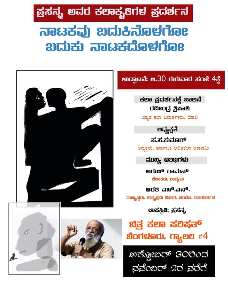 ಬೆಂಗಳೂರು : ಪ್ರಸನ್ನ ಇವರ ಕಲಾಕೃತಿಗಳ ಪ್ರದರ್ಶನ ‘ನಾಟಕವು ಬದುಕಿನೊಳಗೋ ಬದುಕು ನಾಟಕದೊಳಗೋ’ ದಿನಾಂಕ 30 ಅಕ್ಟೋಬರ್ 2025ರಂದು ಸಂಜೆ 4-00 ಗಂಟೆಗೆ ಬೆಂಗಳೂರಿನ ಚಿತ್ರ ಕಲಾ ಪರಿಷತ್ ಗ್ಯಾಲರಿ 4ರಲ್ಲಿ ಉದ್ಘಾಟನೆಗೊಳ್ಳಲಿದೆ.