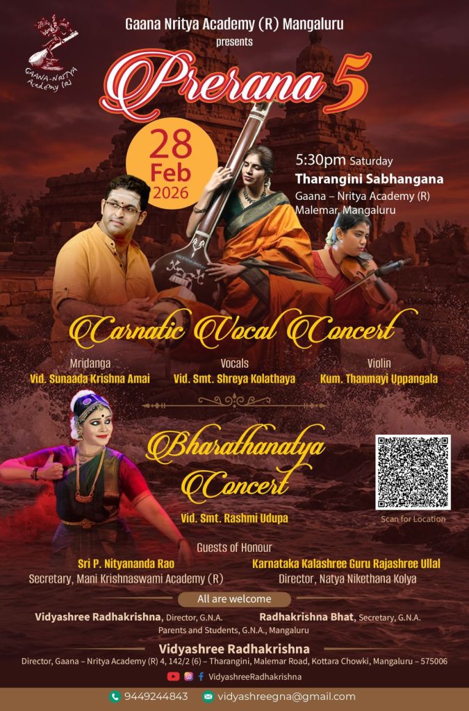 ಮಂಗಳೂರು : ಗಾನ ನೃತ್ಯ ಅಕಾಡೆಮಿ (ರಿ.) ಮಂಗಳೂರು ಪ್ರಸ್ತುತ ಪಡಿಸುವ ‘ಪ್ರೇರಣಾ 5’ ಸಂಗೀತ ಕಛೇರಿ ಮತ್ತು ಭರತನಾಟ್ಯ ಪ್ರದರ್ಶನ ಕಾರ್ಯಕ್ರಮವನ್ನು ದಿನಾಂಕ 28 ಫೆಬ್ರವರಿ 2026ರಂದು ಸಂಜೆ 5-30 ಗಂಟೆಗೆ ಮಂಗಳೂರಿನ ಮಾಲೆಮಾರ್ ಇಲ್ಲಿರುವ ಗಾನ ನೃತ್ಯ ಅಕಾಡೆಮಿಯ ತರಂಗಿಣಿ ಸಭಾಂಗಣದಲ್ಲಿ ಆಯೋಜಿಸಲಾಗಿದೆ.